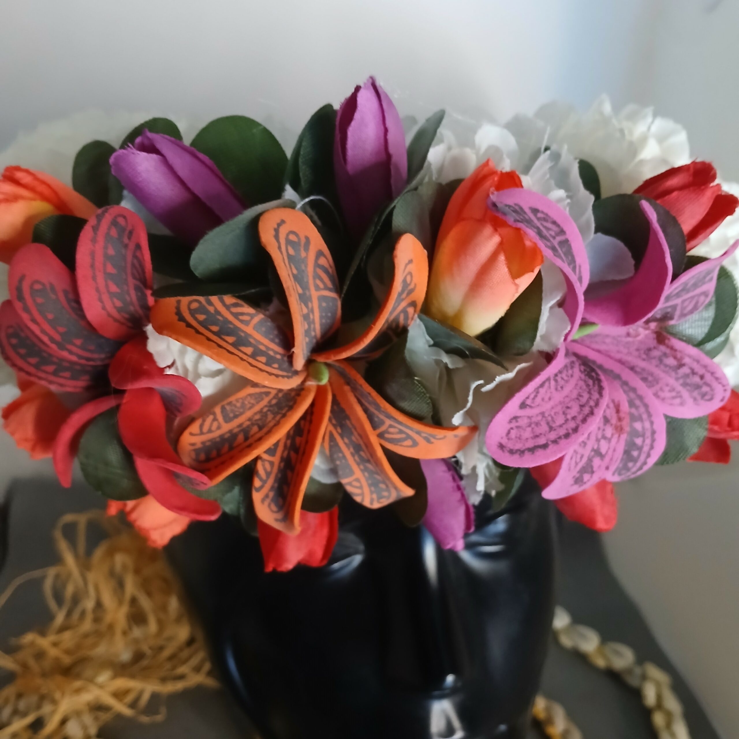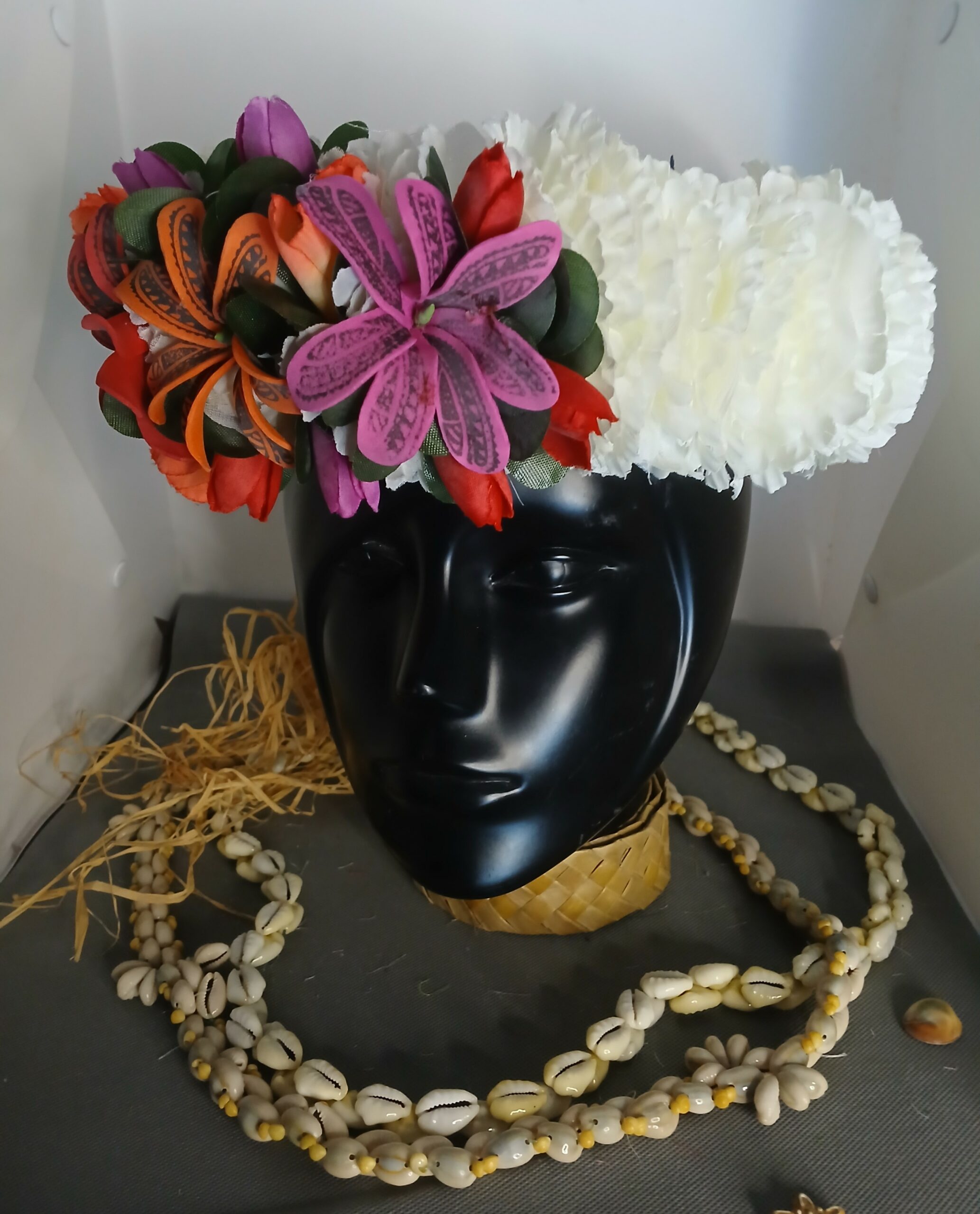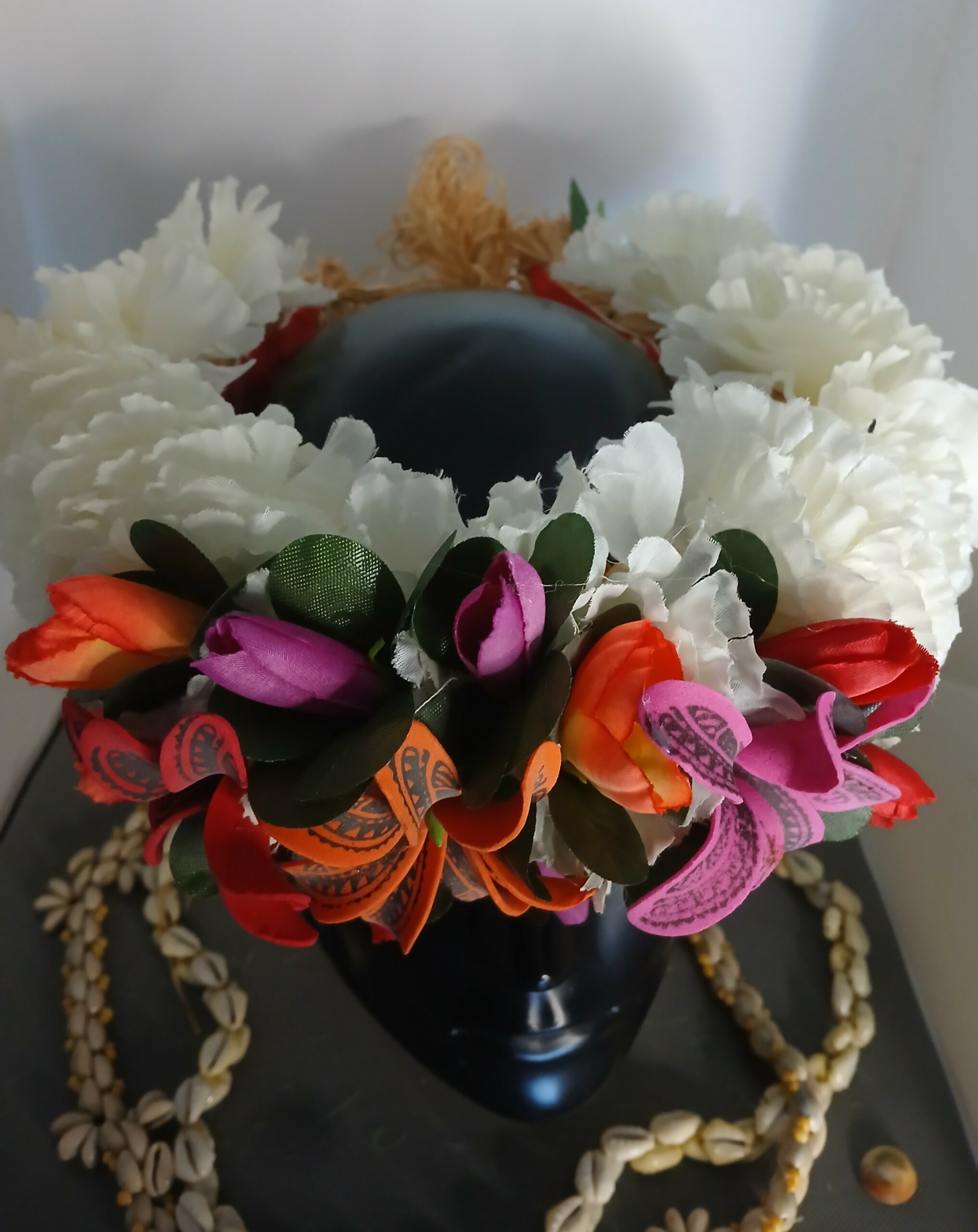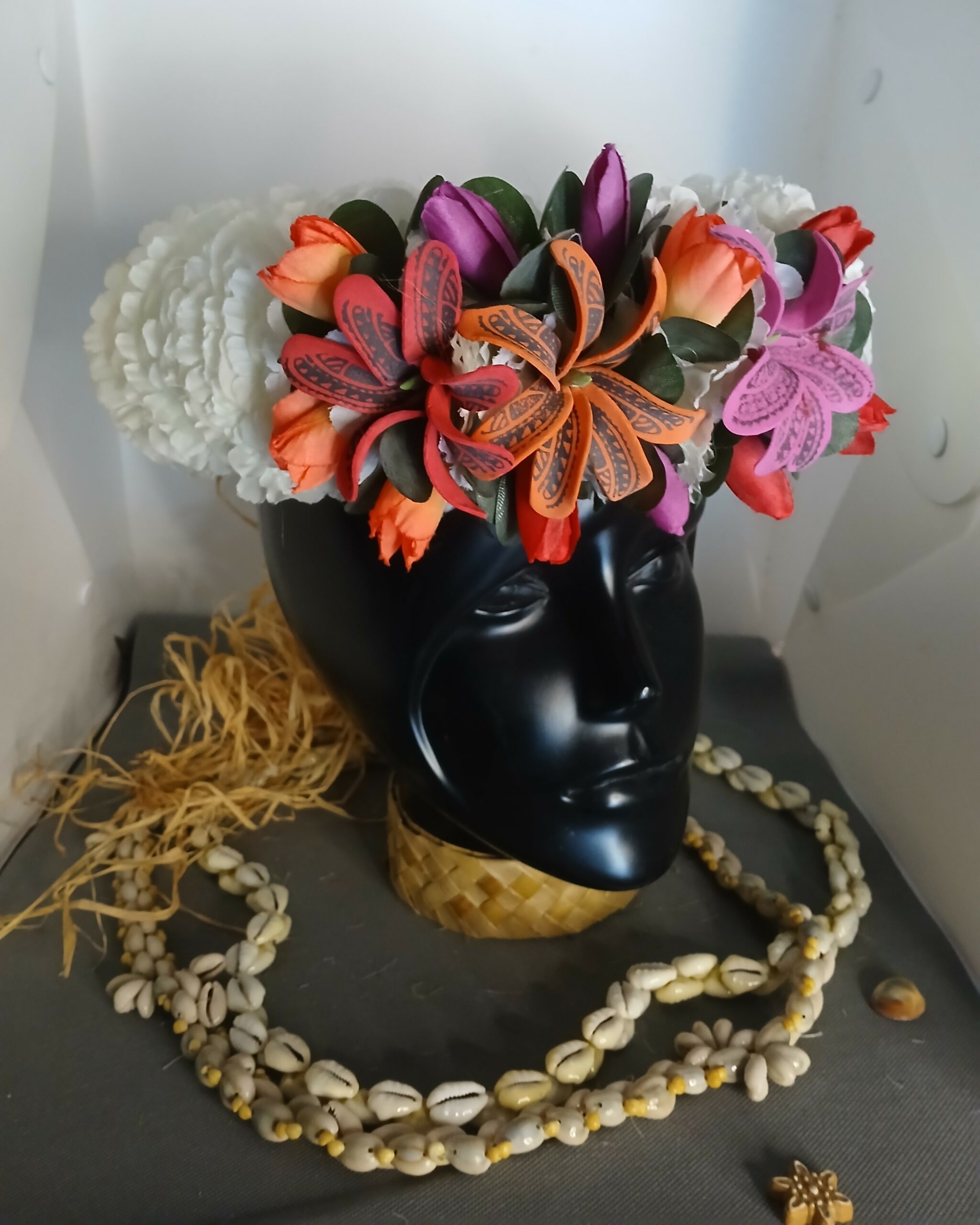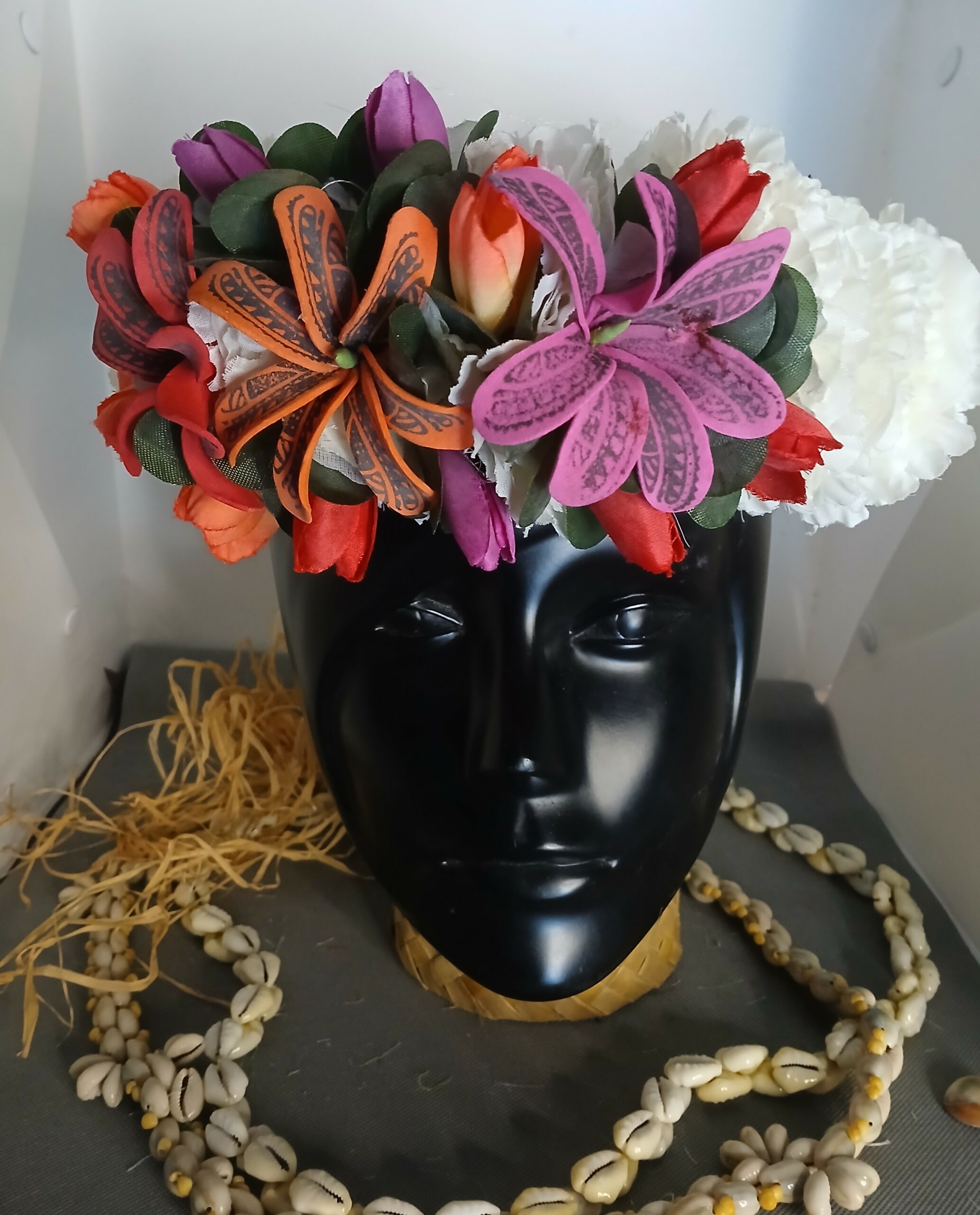 Donc les couronnes et colliers de fleurs sont traditionnellement utilisés en Polynésie pour accueillir les visiteurs. Offrir ou porter des fleurs est un geste d’hospitalité, de respect et de bienvenue. Cela crée une atmosphère chaleureuse et accueillante, que ce soit pour des invités ou pour soi-même.