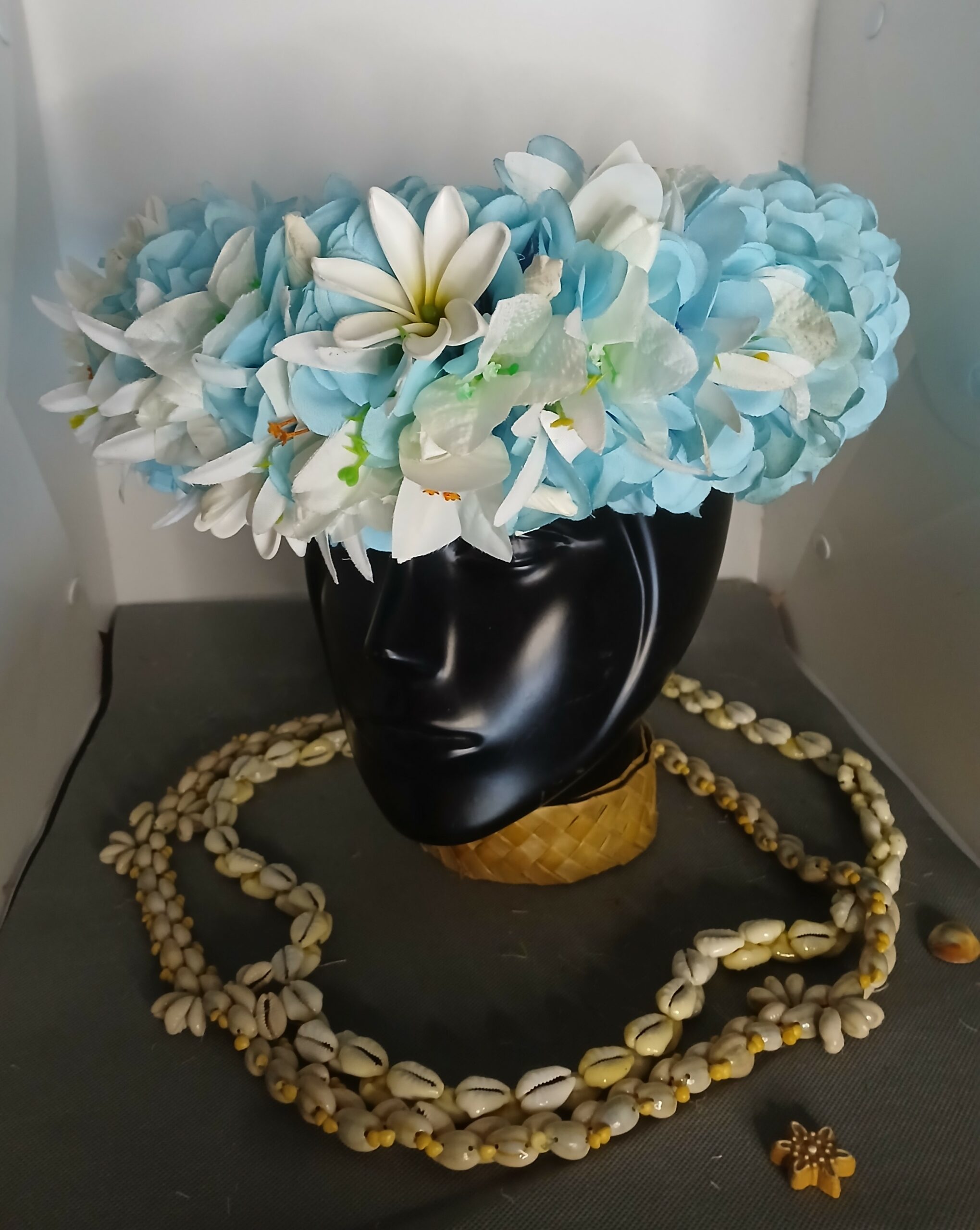 Couronne fleur Tahiti  bleu lagon bougainvillier lys élancés boutons blancs  et trois  tiare entre ouverte