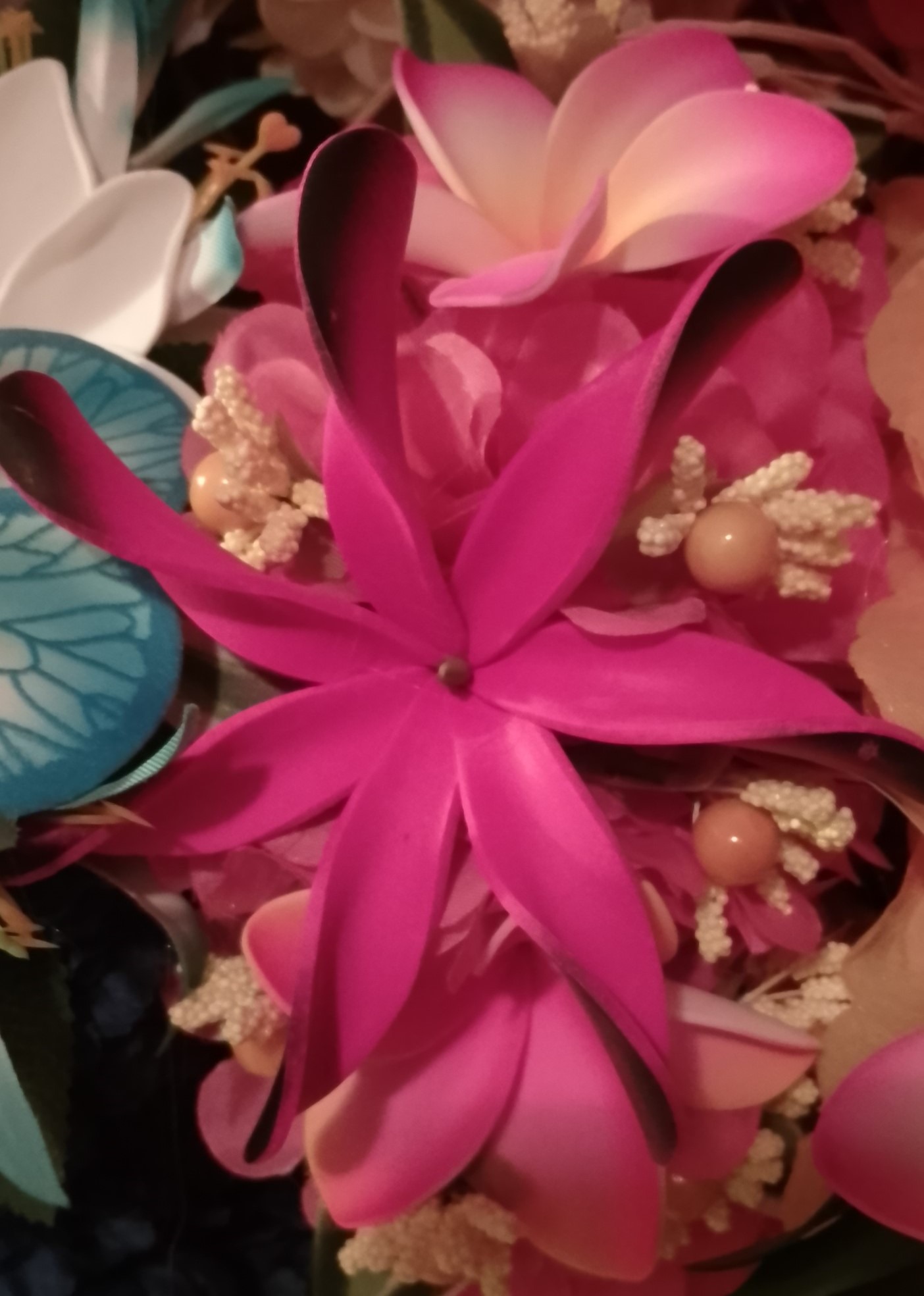 Les fleurs de frangipanier et la maxi tiare sont en mousse