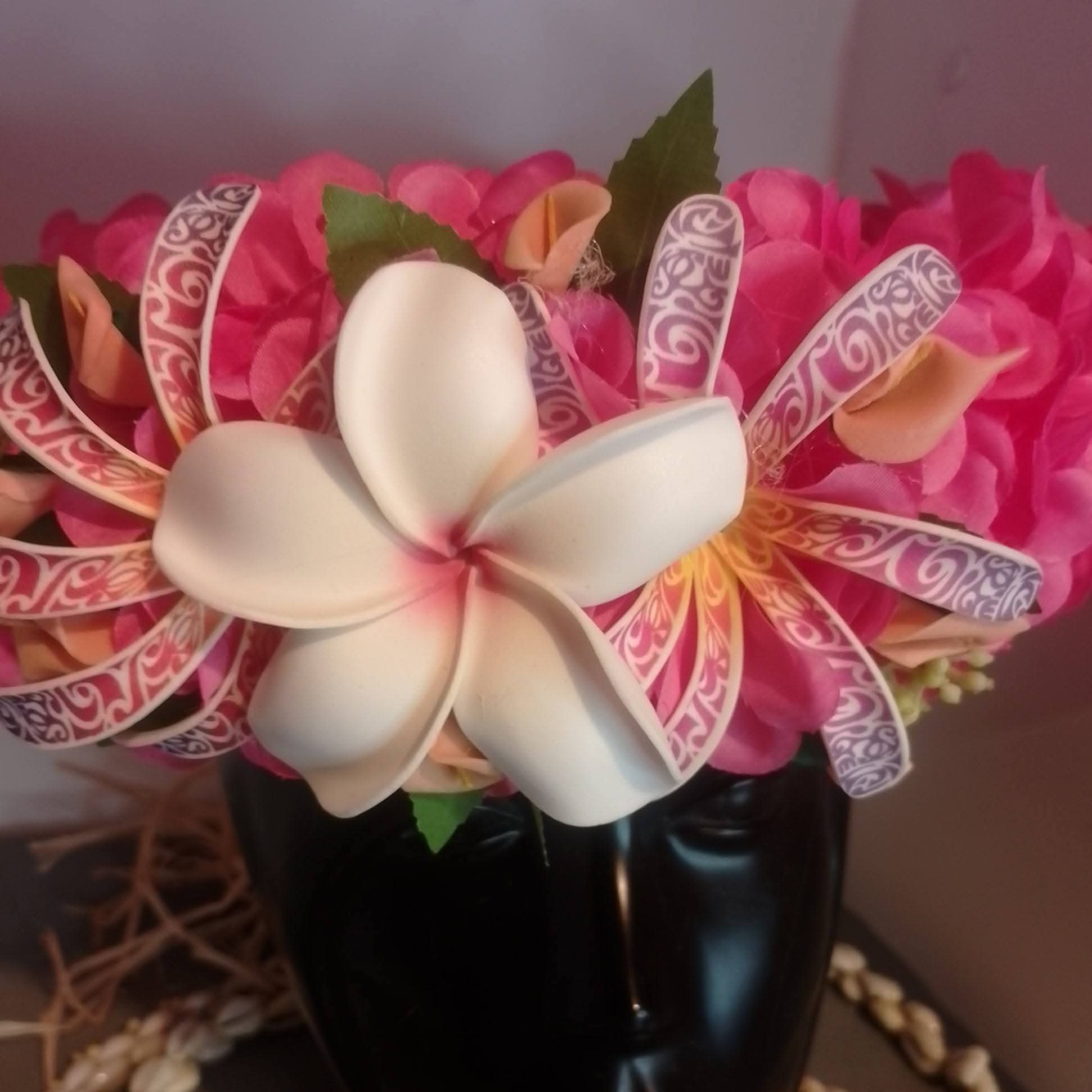 La fleur de frangipanier et les tiare tatouées sont en mousse