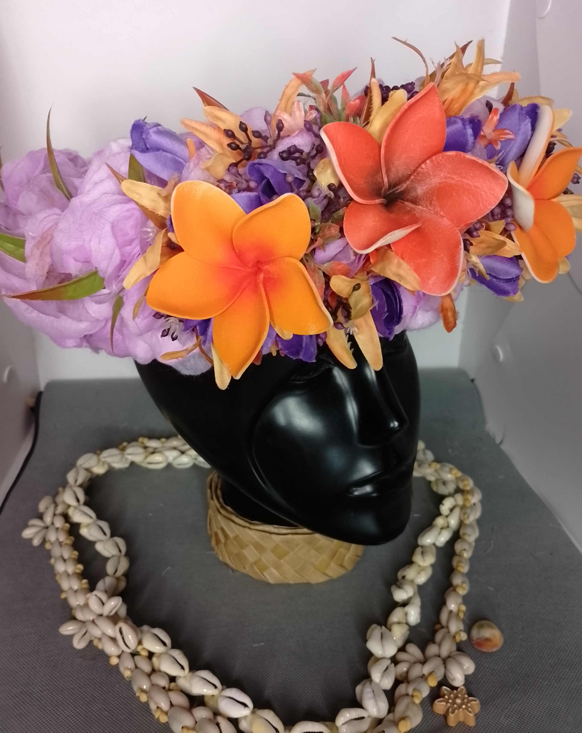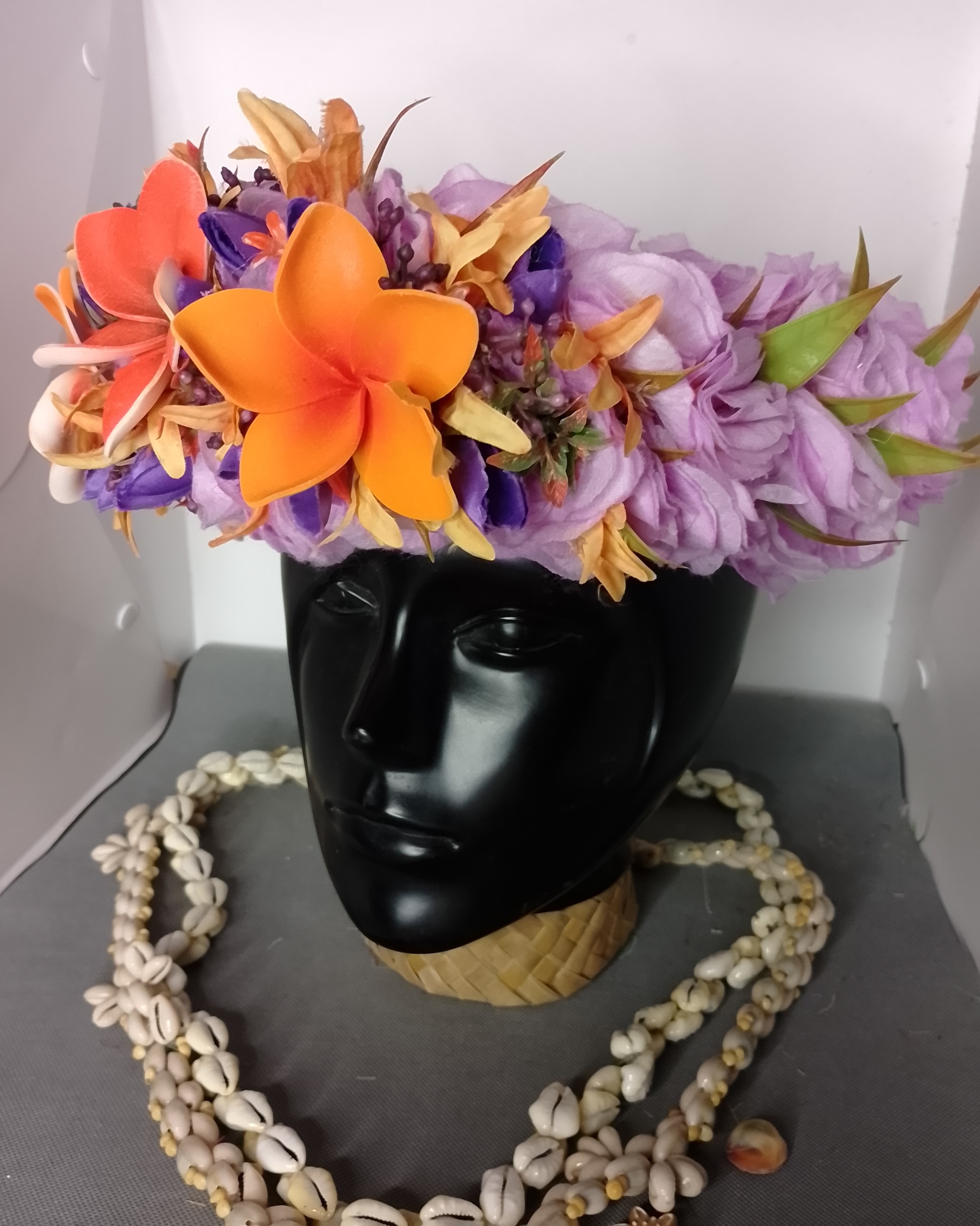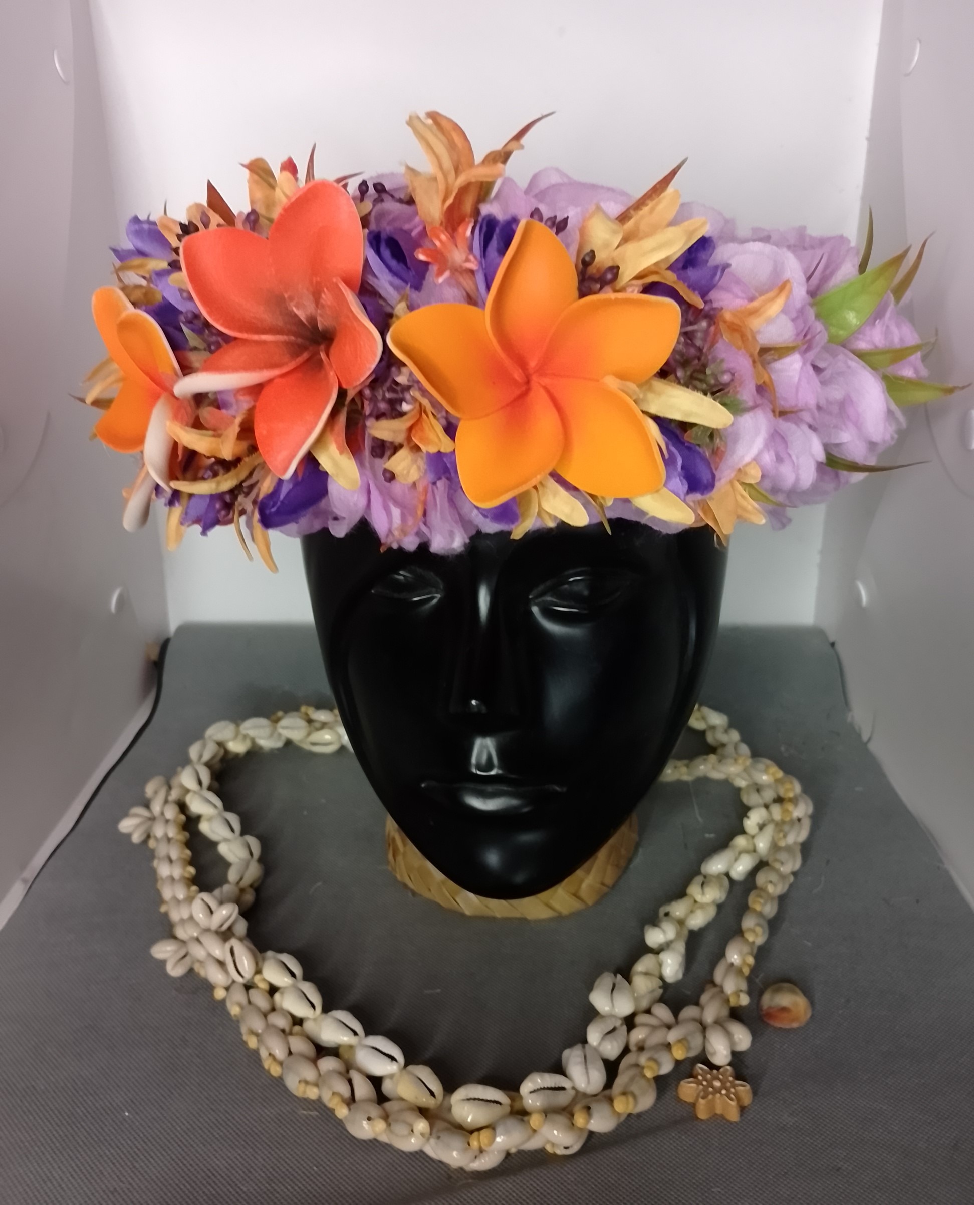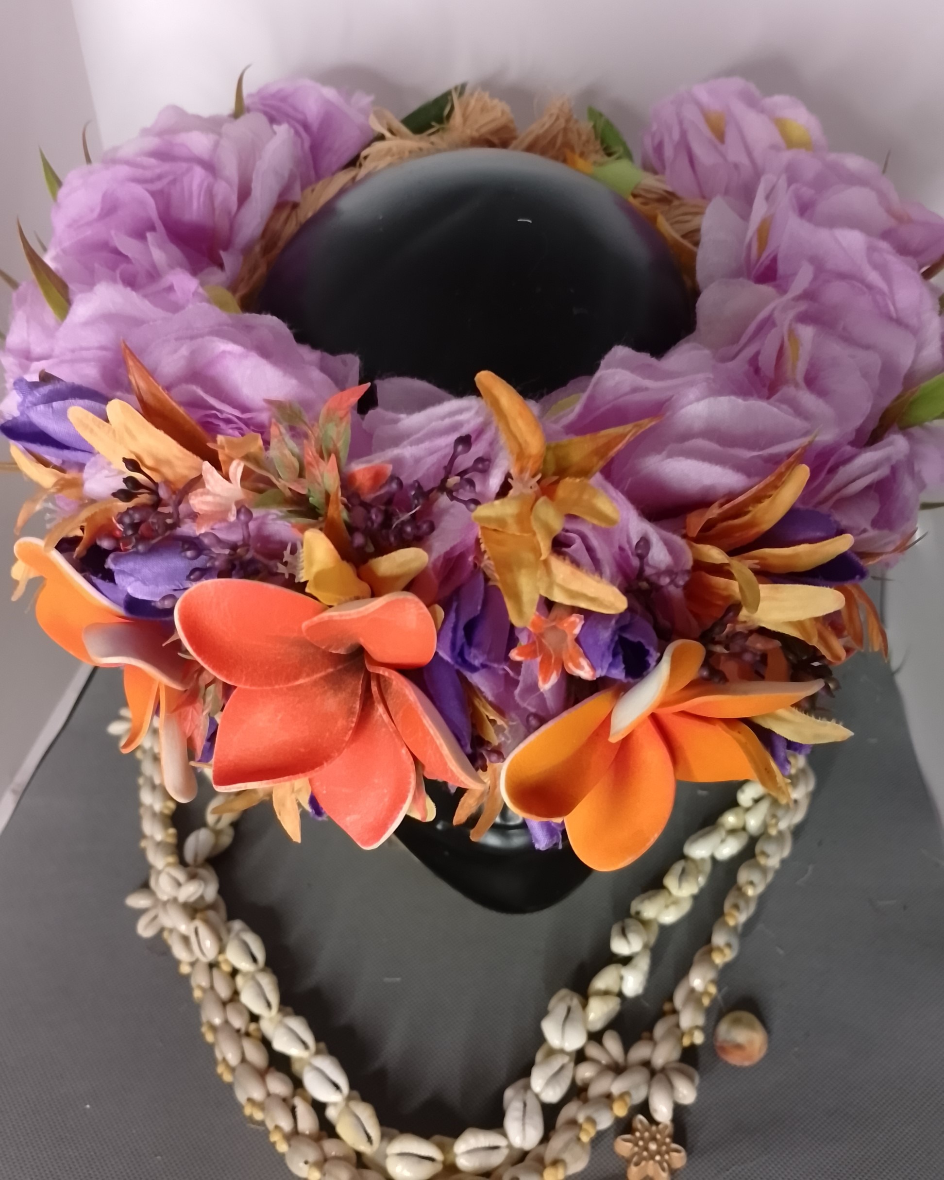 Couronne de fleurs Tahiti mauve trois tipanie oranges