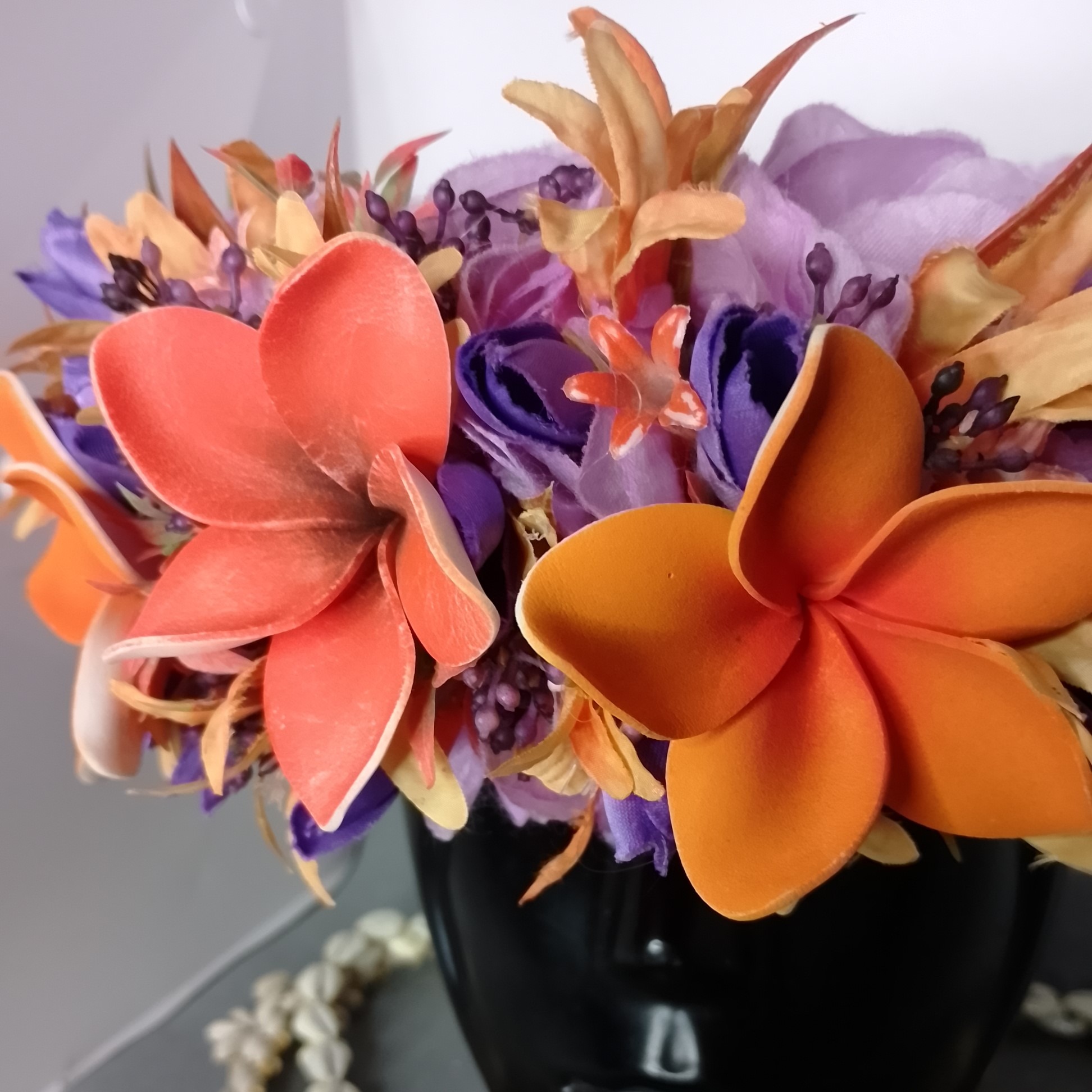 Les composants de la Couronne de fleurs Tahiti mauve trois tipanie oranges ont pour :