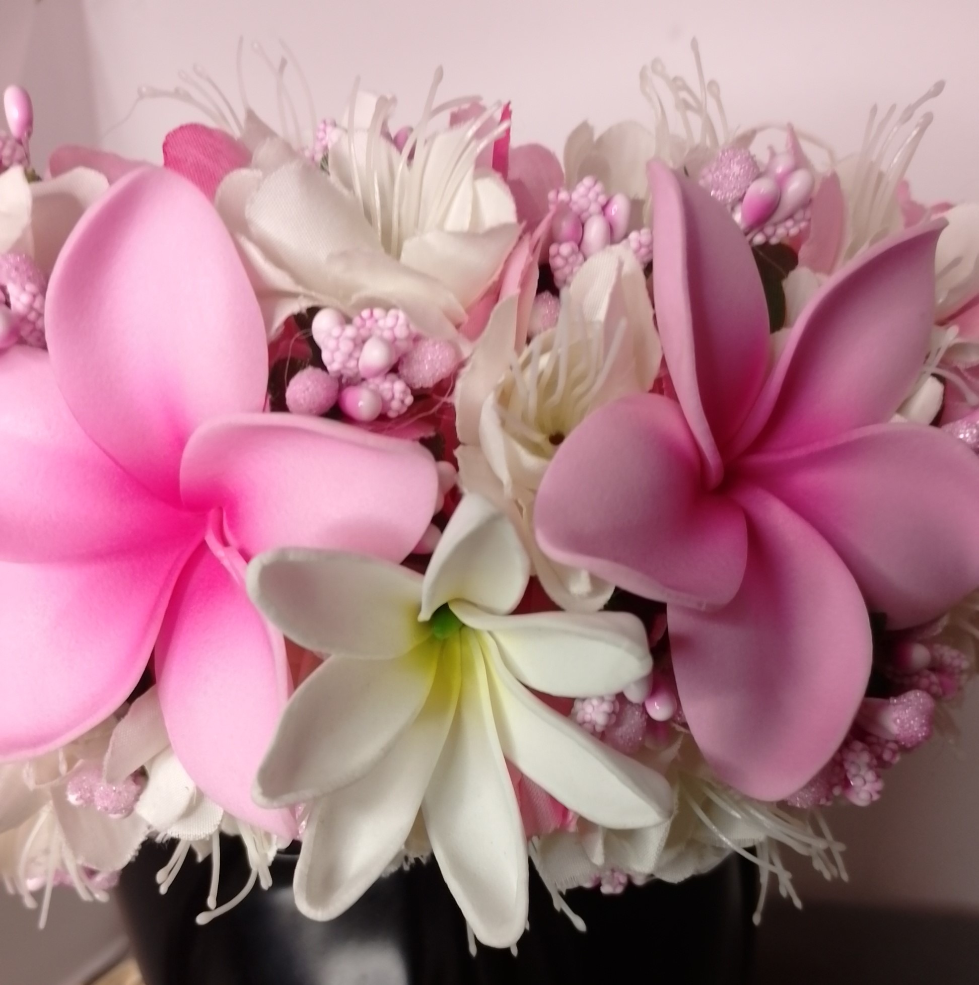 Les fleurs de frangipanier et la tiare sont en mousse.