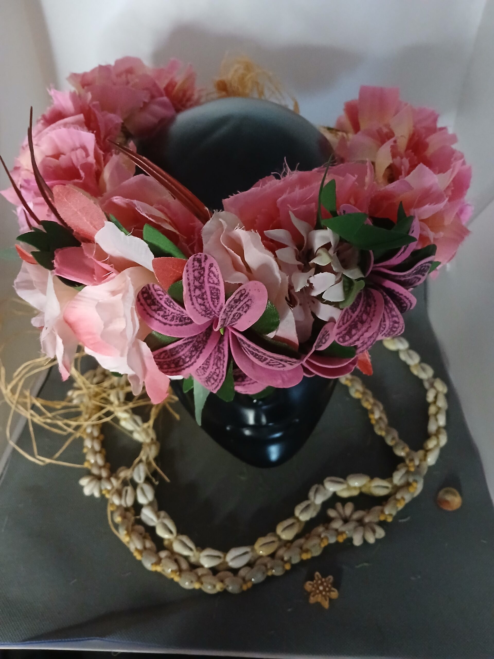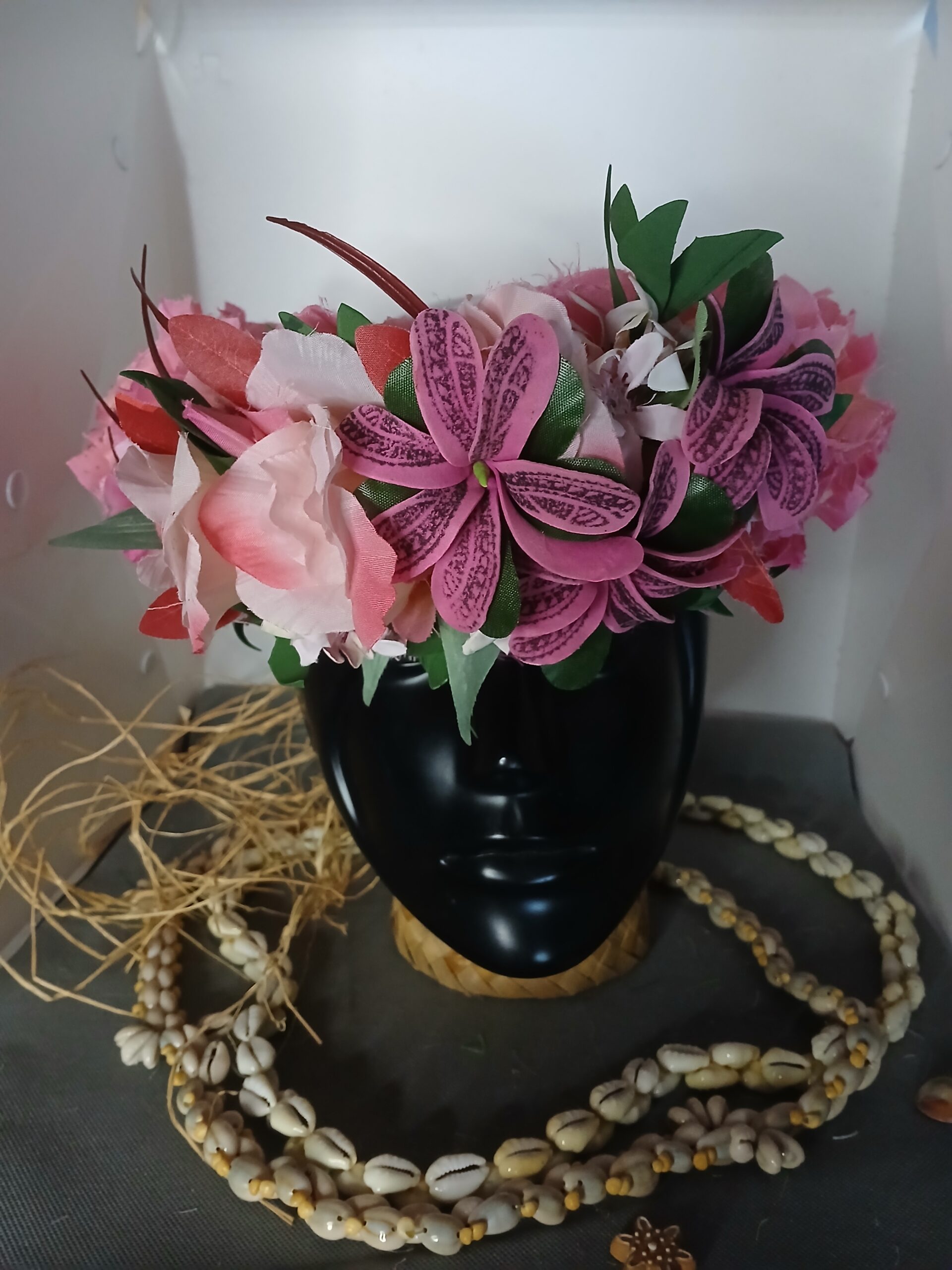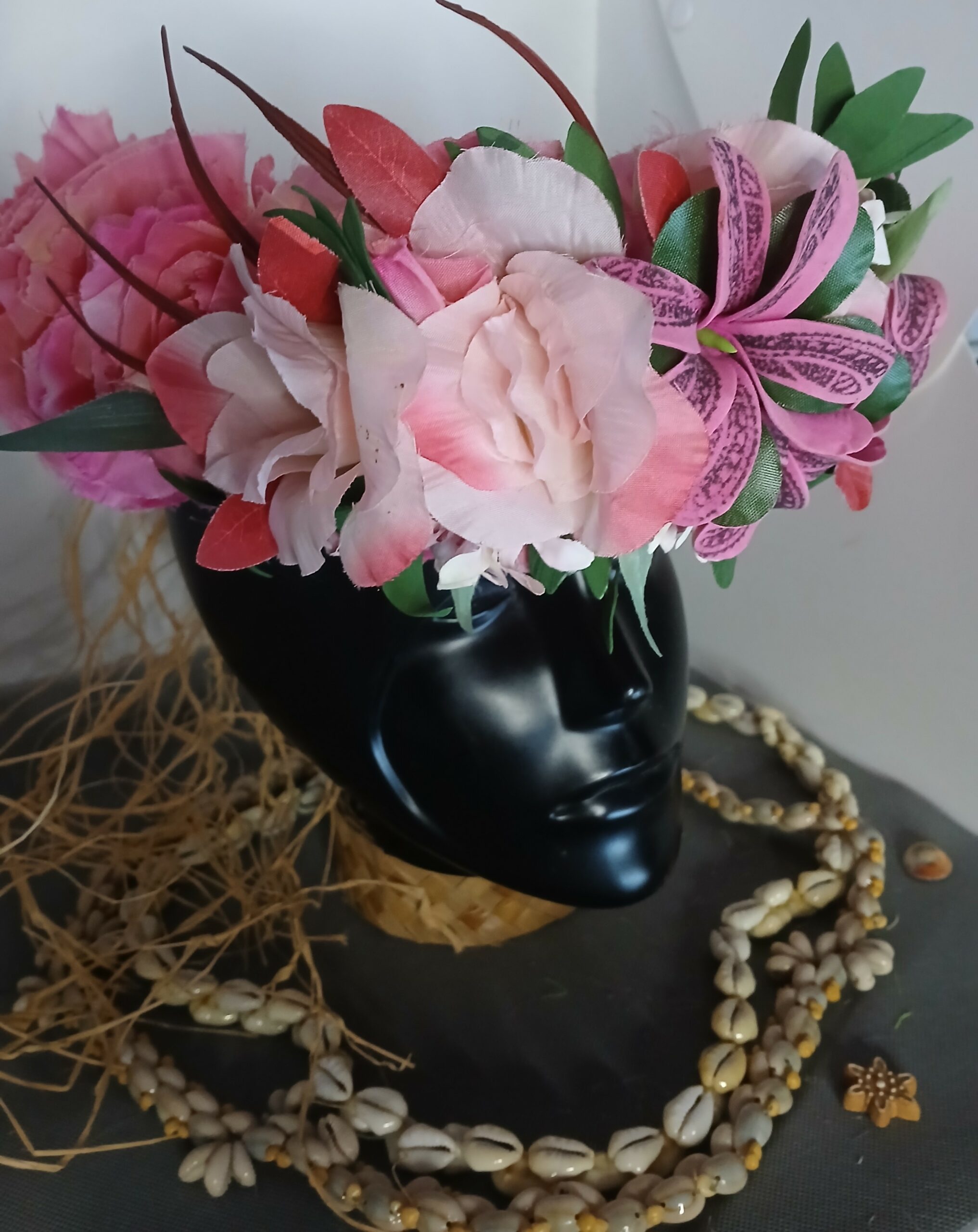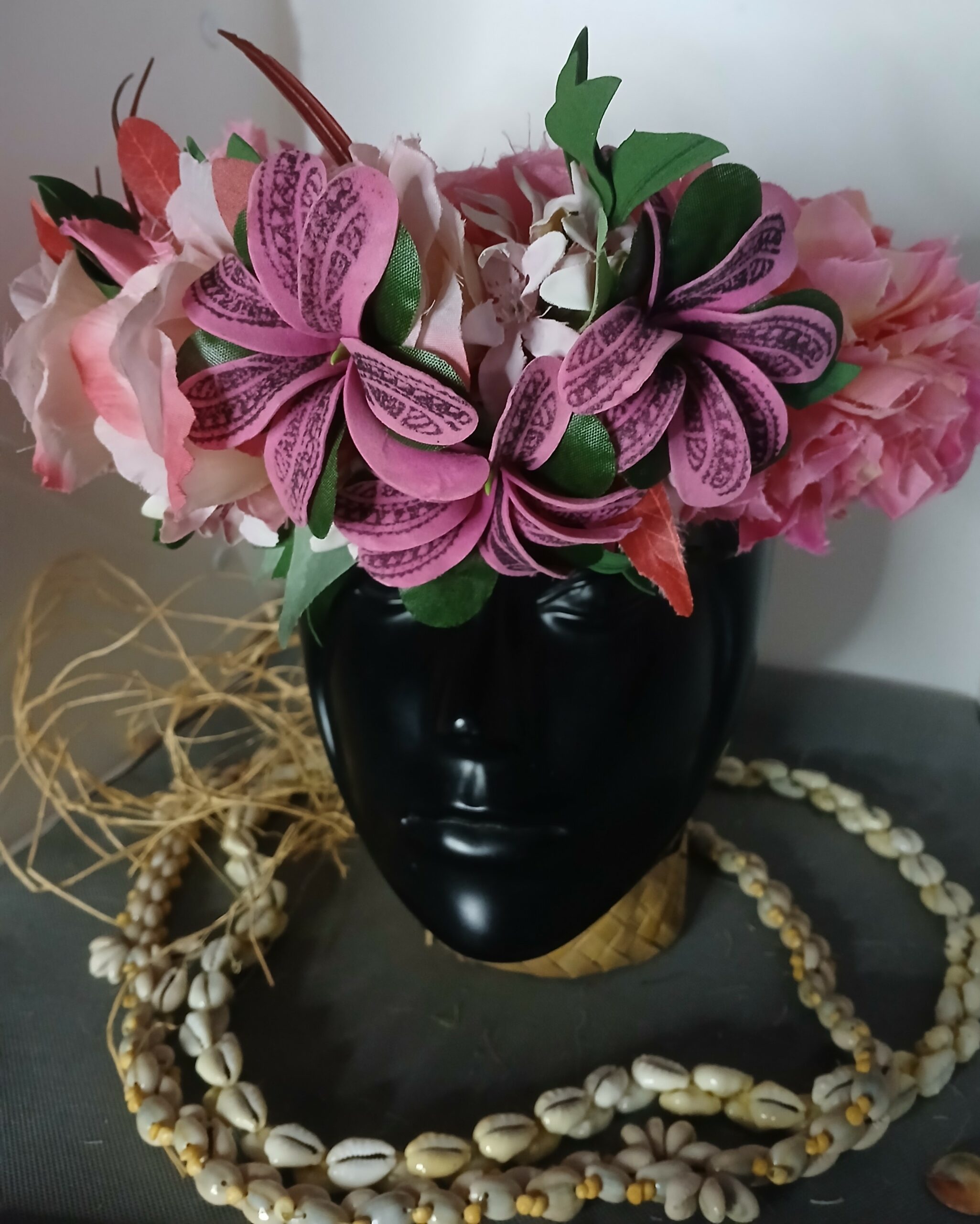 Ainsi composes ta Couronne florale de tête artisanale fleurs Tahiti permanentes en fonction des produits en stock pour un service rapide.