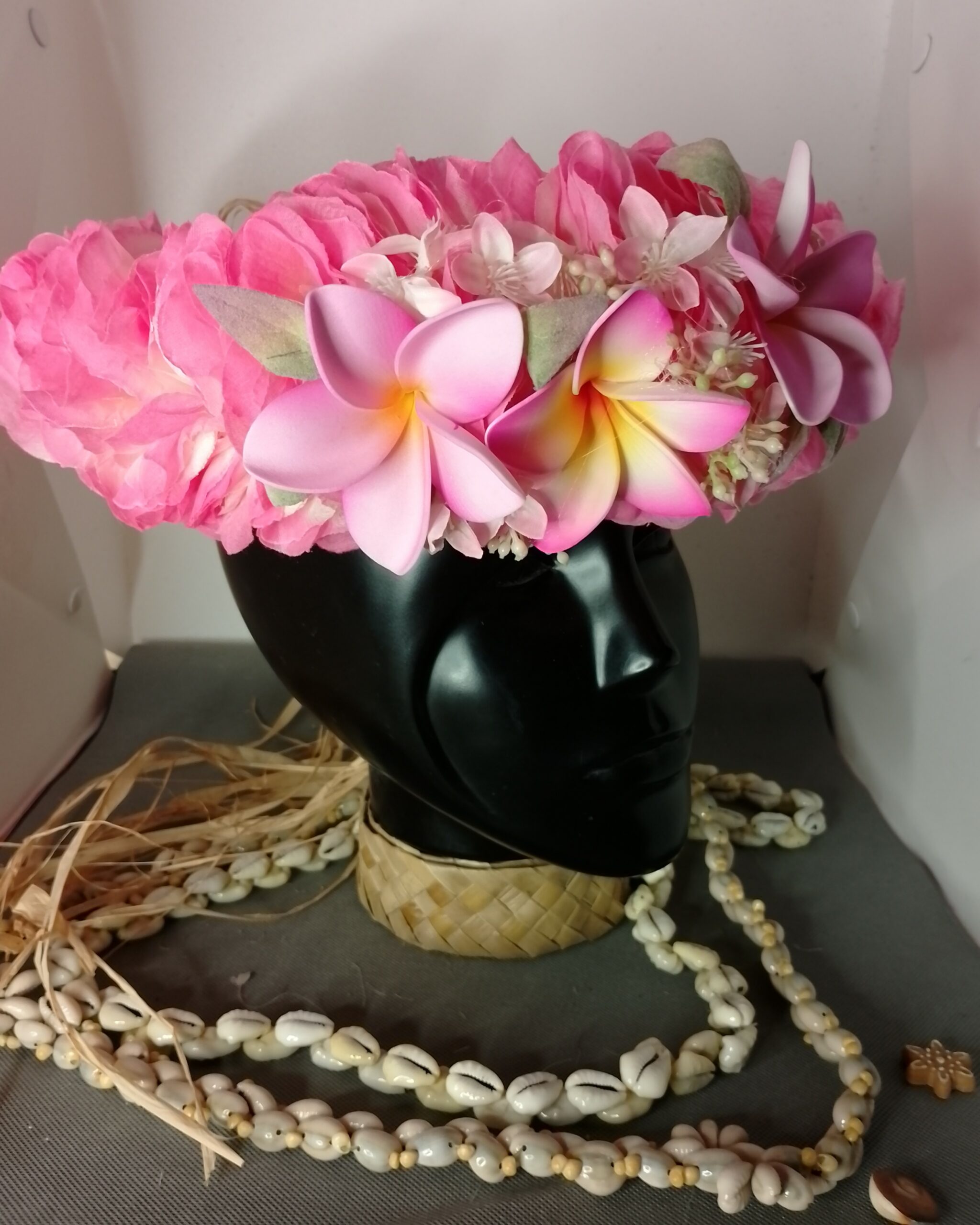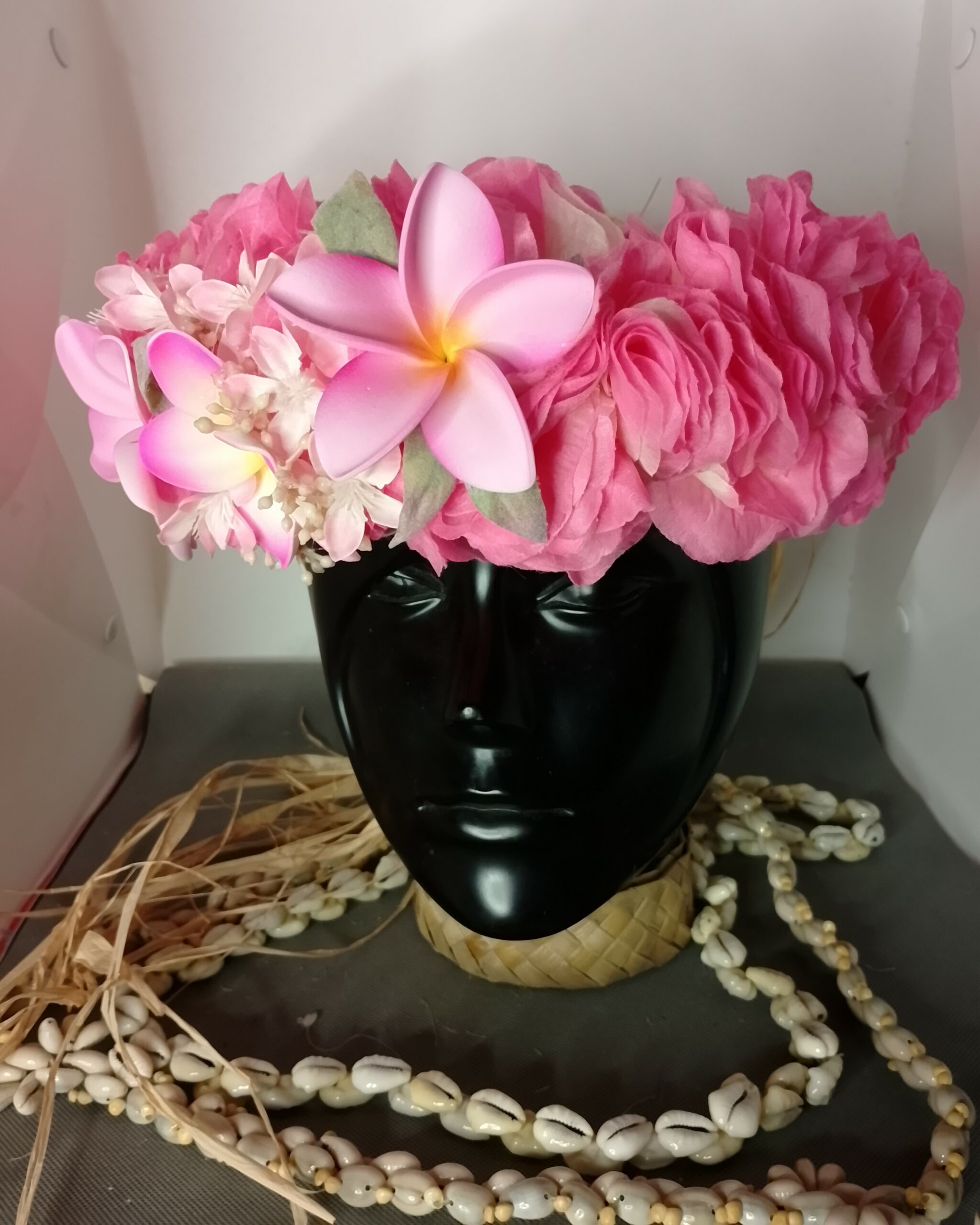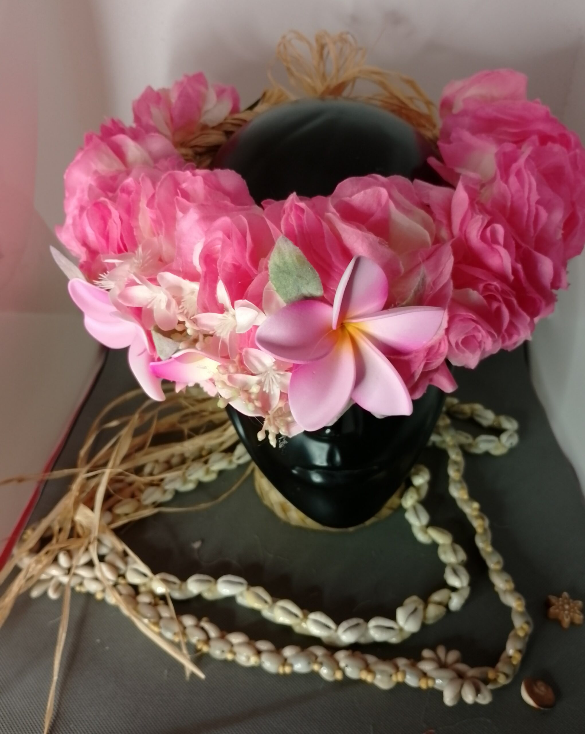 La Couronne fleur Tahiti rose trois tipanie roses feuilles de sauge montée sur une base en raphia tressé. La base se termine par des liens ainsi la couronne s’adapte au tour de tête de la vahine.