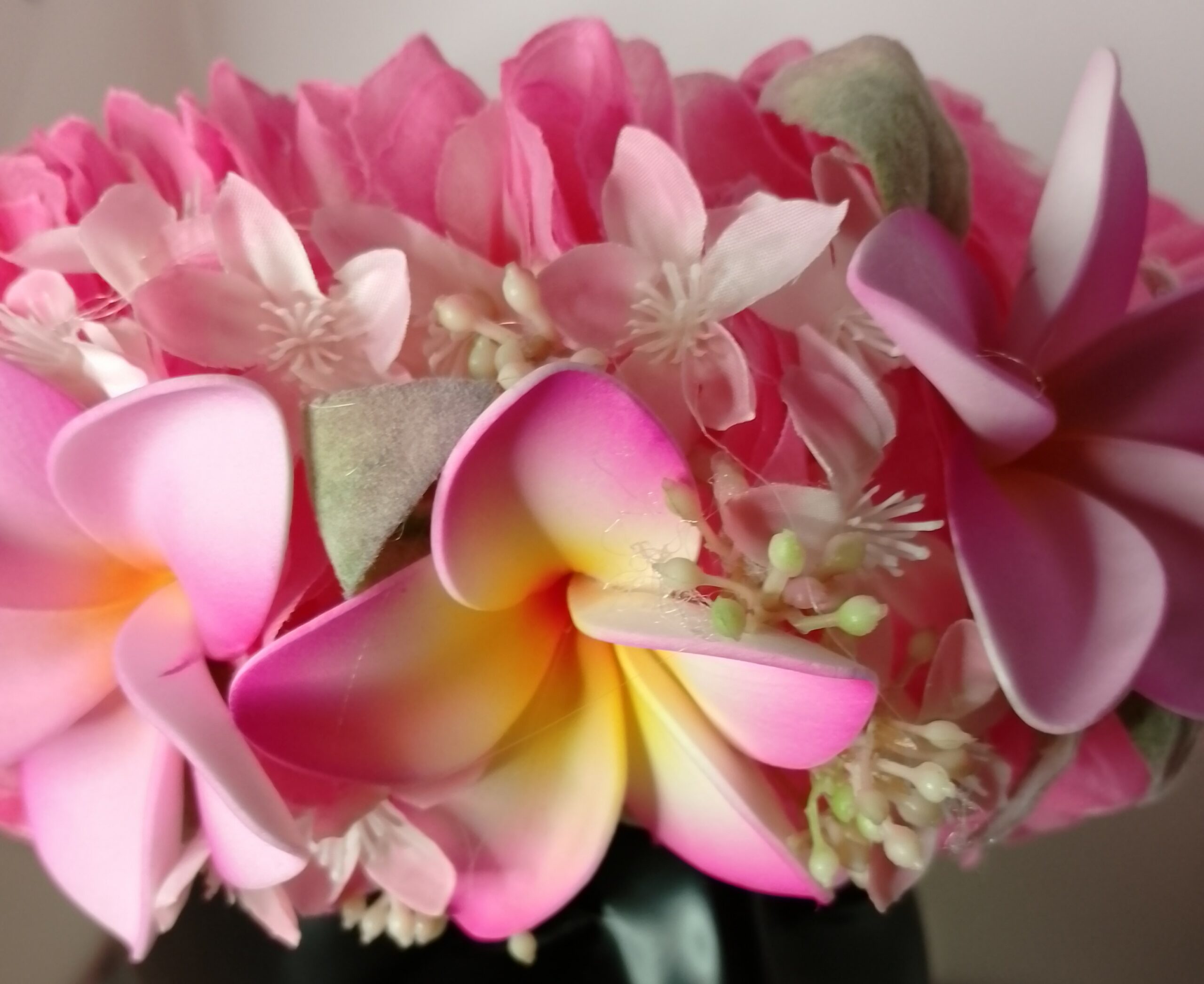 (tipanie de Tahiti, pluméria), d’orchidées, de bougainvilliers, d’hibiscus en mousse ou en tissu