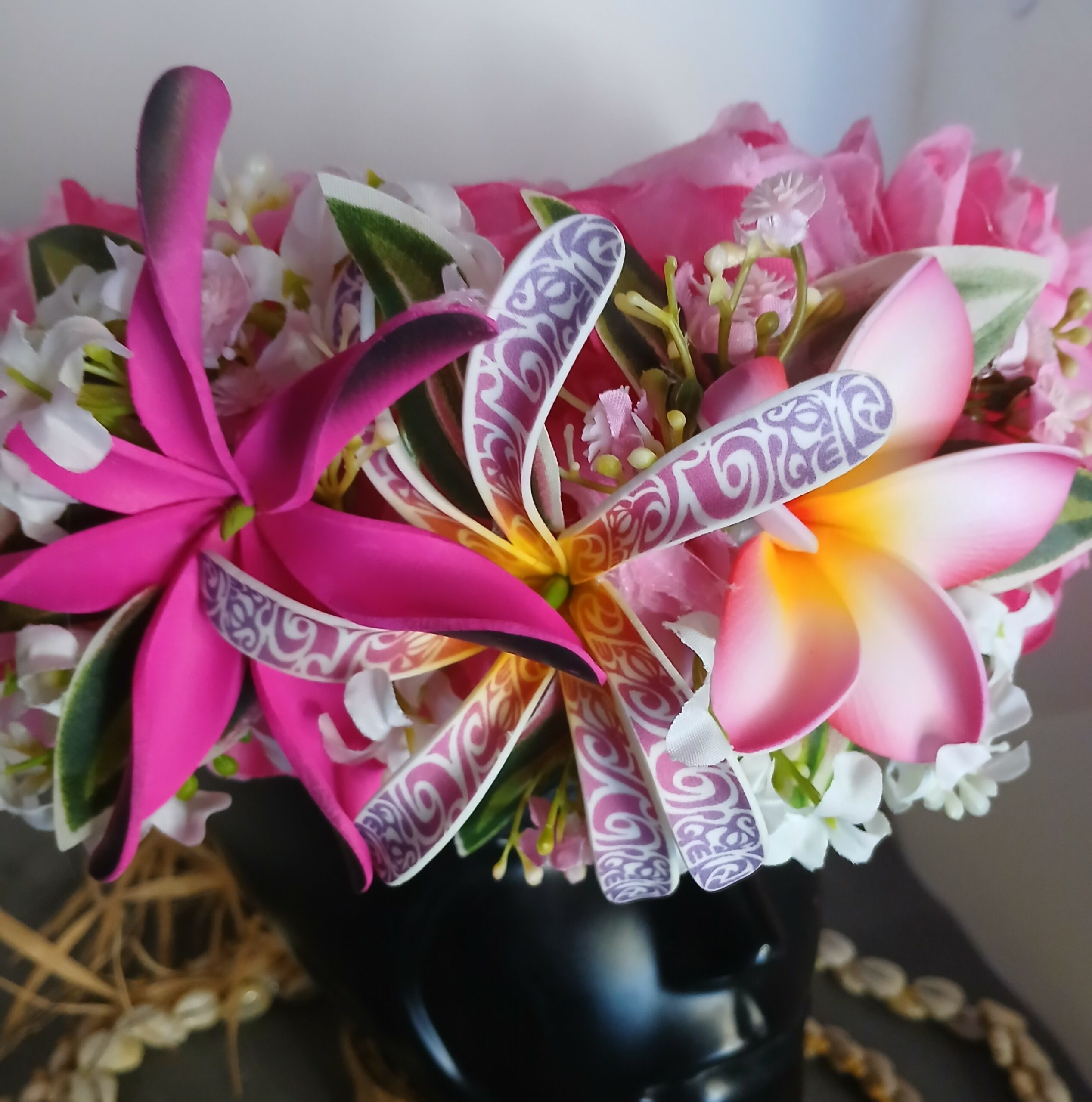 – pour le bouquet : possibilités de choisir une large gamme de fleurs de tiare, de fleur de frangipanier ( tipanie de Tahiti, pluméria), d’orchidées, de bougainvilliers, d’hibiscus en mousse ou en tissu
