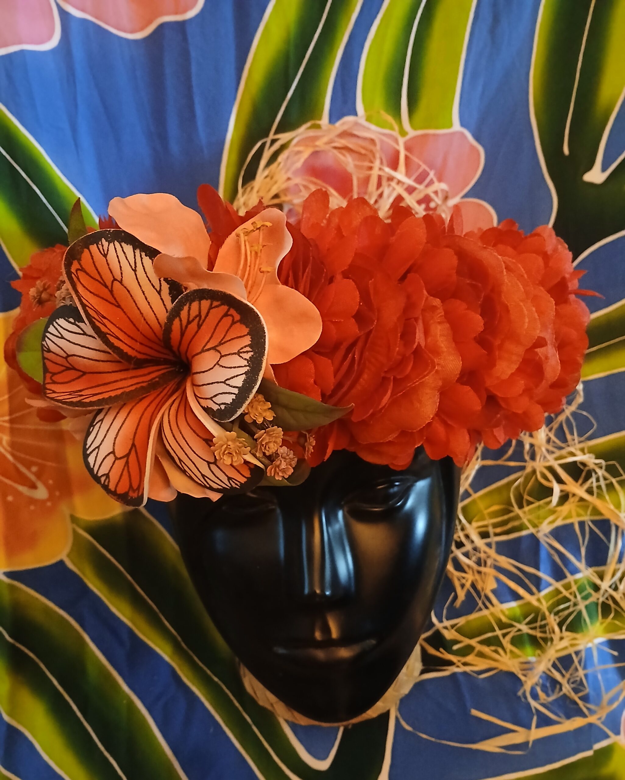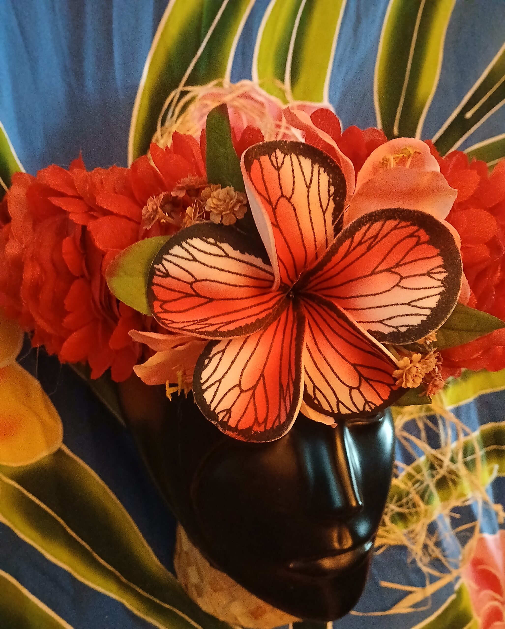 Couronne fleur Tahiti rouge maxi tipanie décor aile de papillon