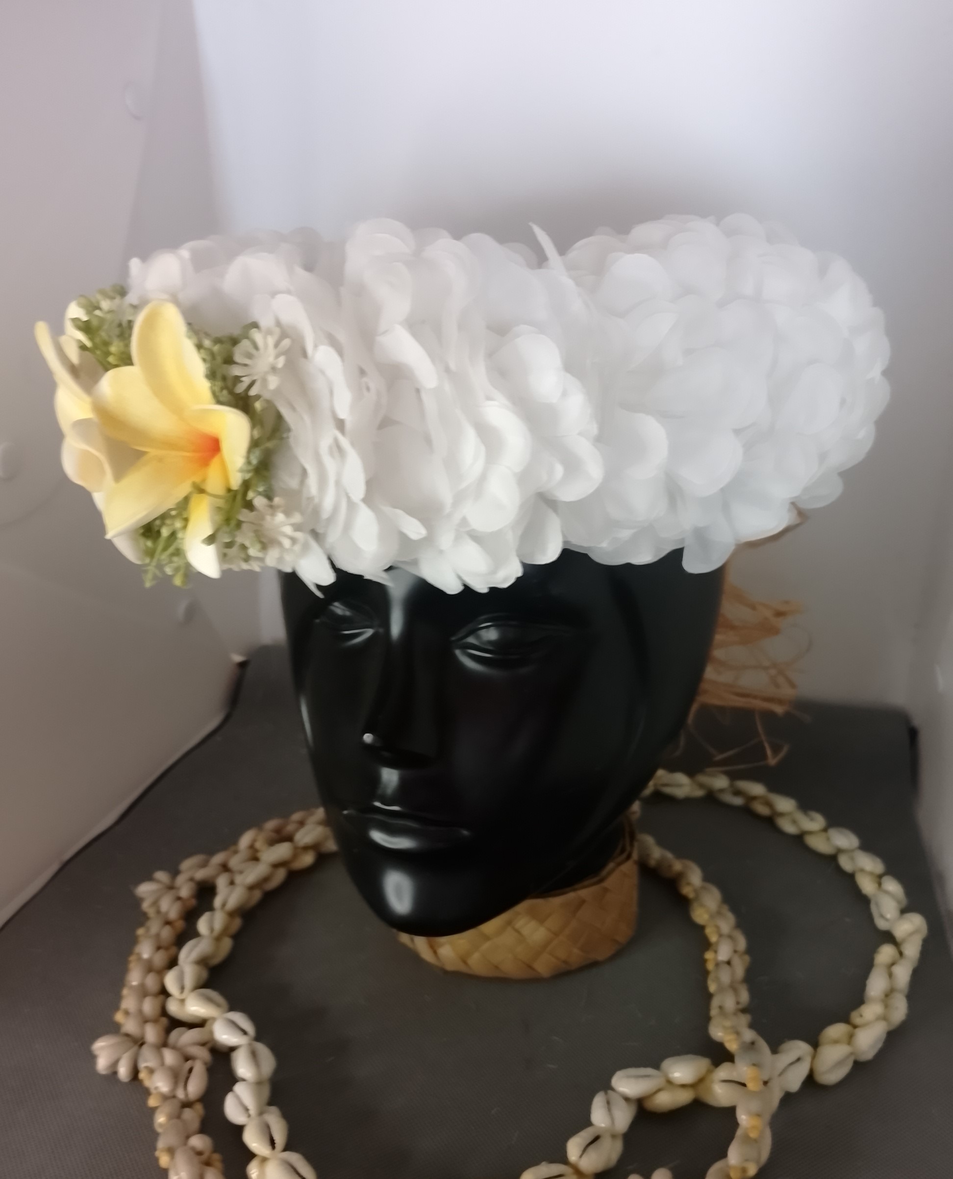 Couronne fleurs Tahiti blanche trois tipanie blancs cœur jaune