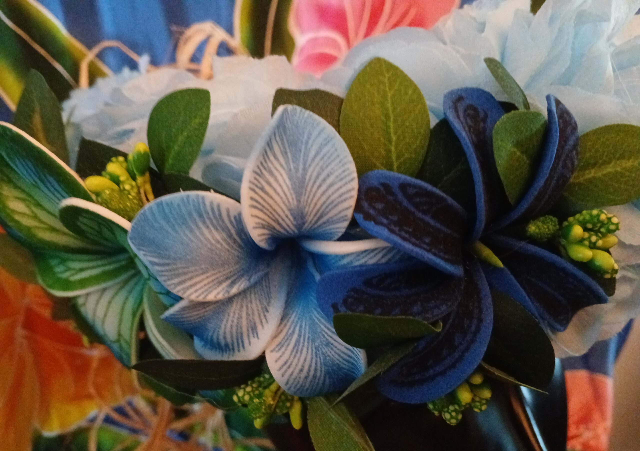 Puis le bouquet est composé d’un maxi tipanie s’ajoutant à un tipanie bleu rainuré et une tiare tatouée. Les fleurs Tahiti sont accompagnés de graines vertes avec différents feuillages. Le maxi tipanie bleu et vert a un décor aile de papillon