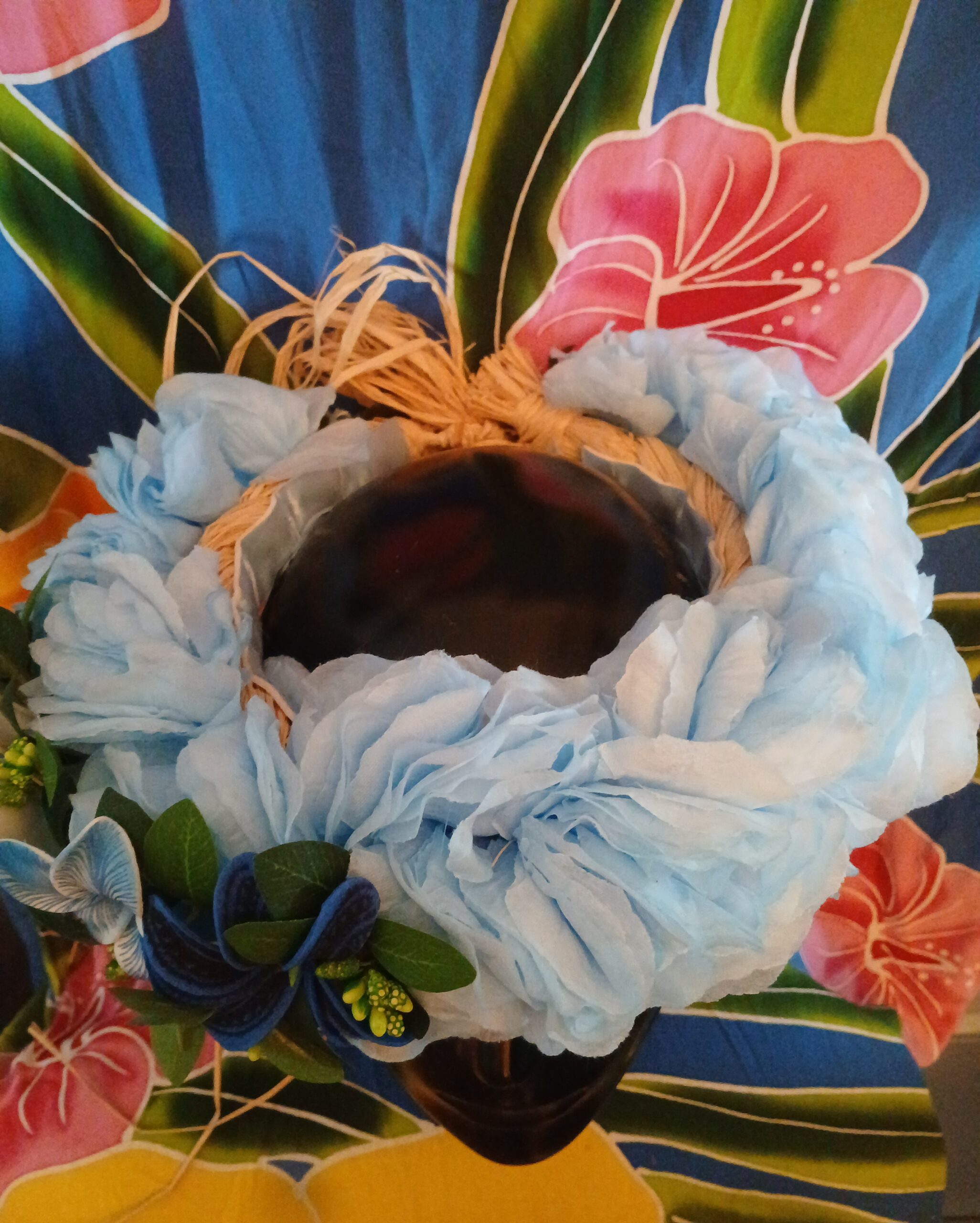 Pour la Couronne fleurs Tahiti bleue maxi tipanie tiare tatouée tipanie rainuré présentée, la base de raphia tressé se termine par des liens.