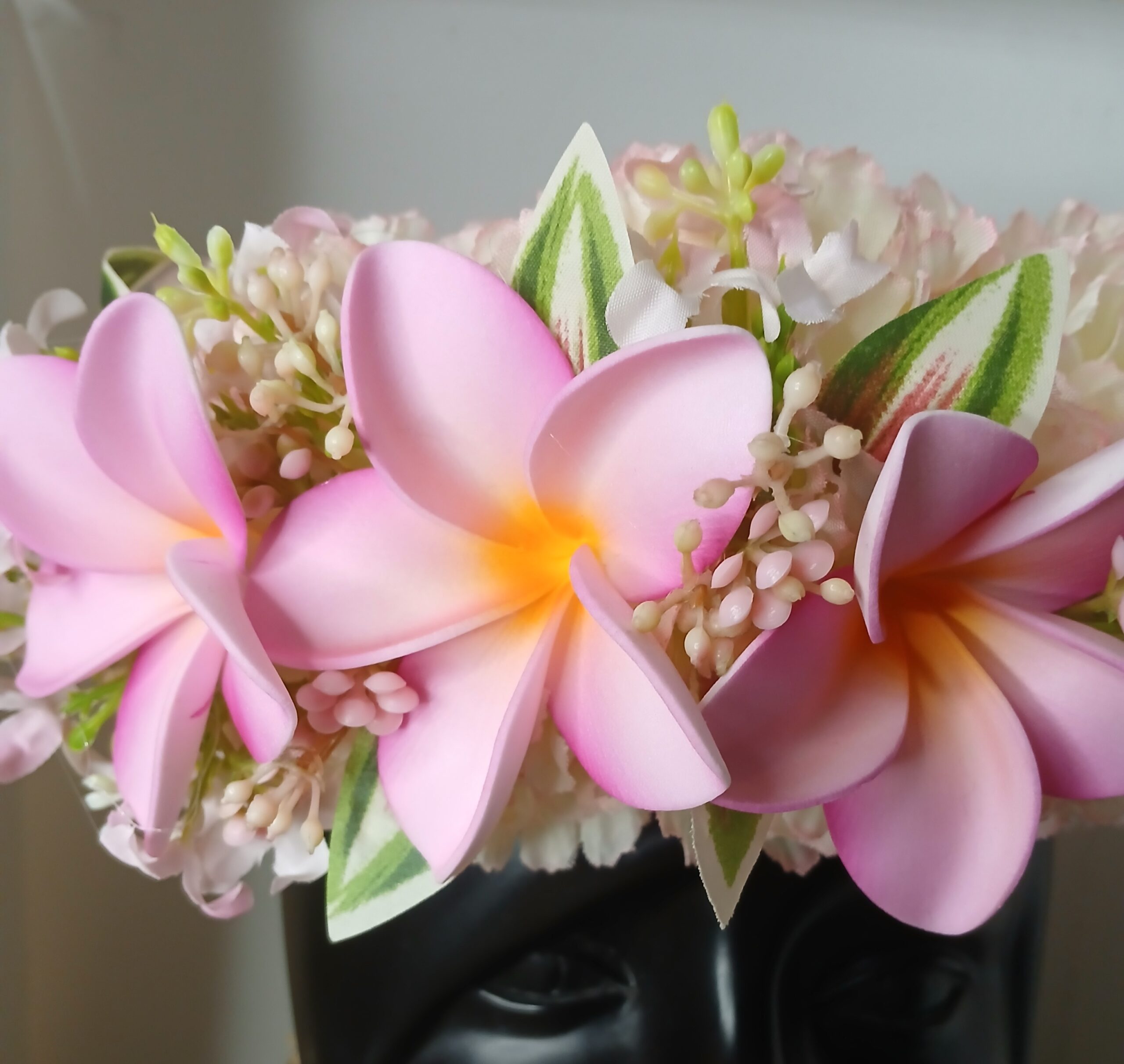 Ensuite la couronne est habillée d’un bouquet de trois fleurs de frangipanier rose au cœur jaune. Ils sont accompagnés de feuillages et de branches de petites fleurs roses pâles .