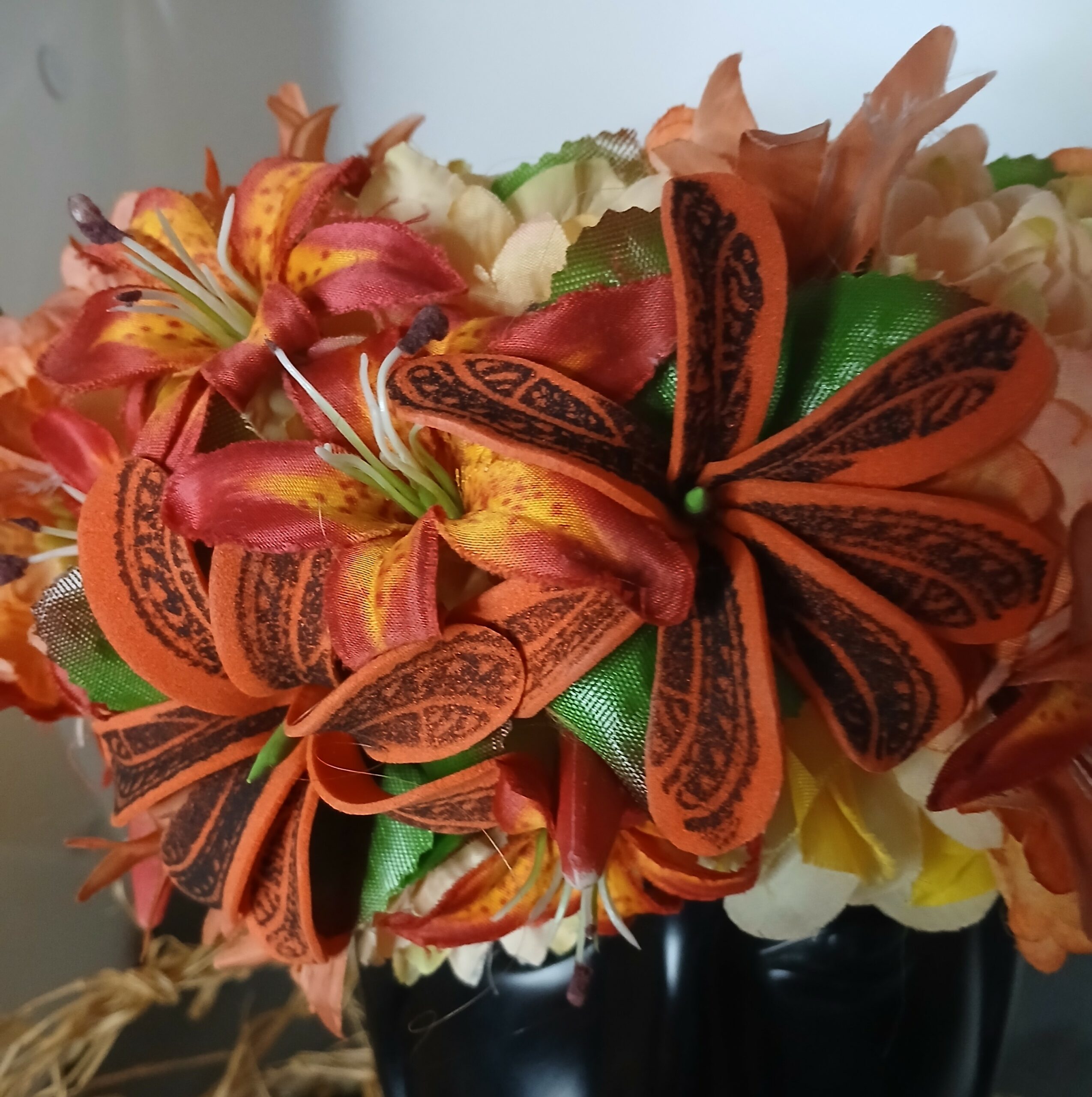 Les orchidées, les mini lys tigré set les boutons sont en tissu.