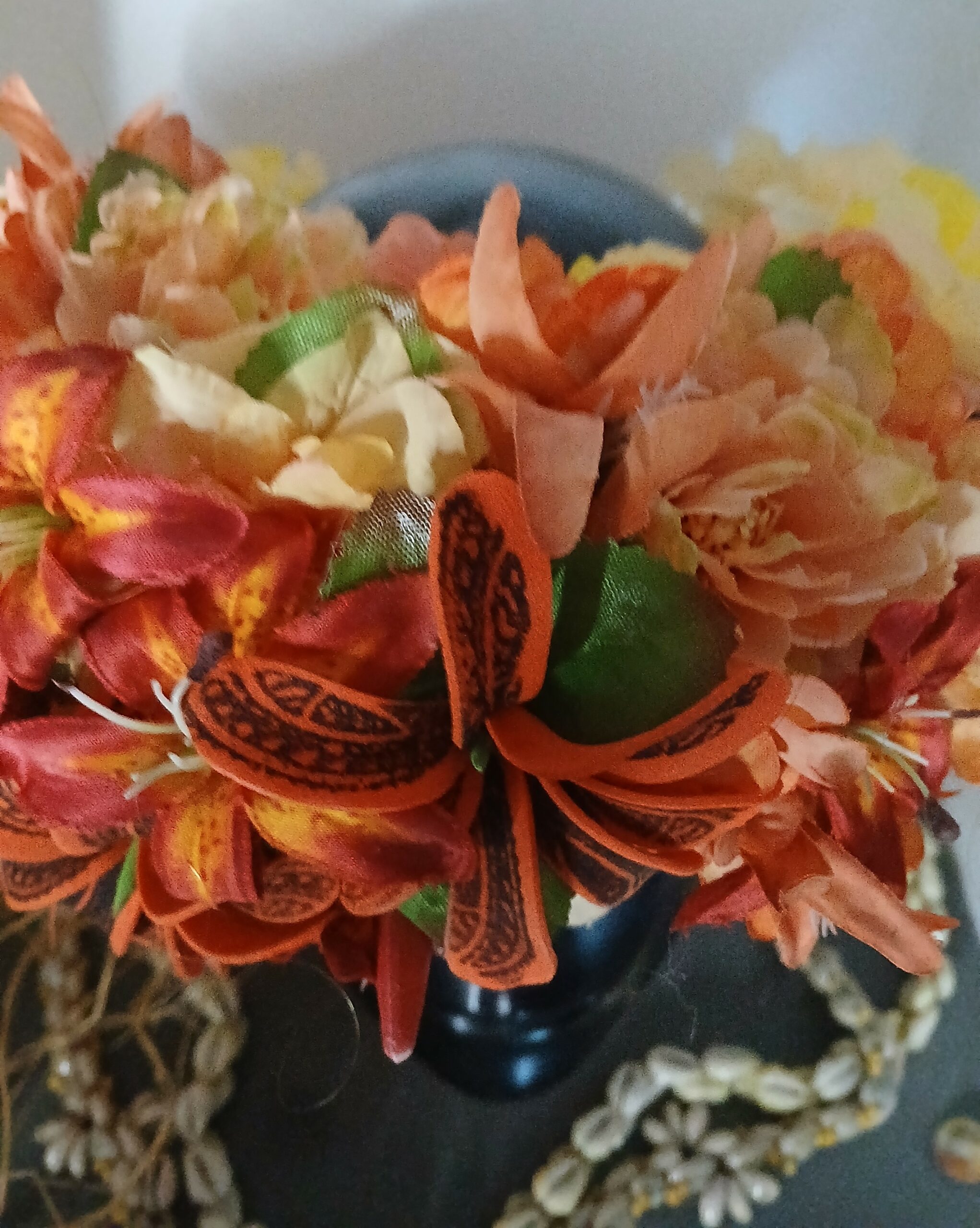 – pour le bouquet : possibilités de choisir une large gamme de fleurs de tiare, de fleur de frangipanier (tipanie de Tahiti, pluméria), d’orchidées, de bougainvilliers, d’hibiscus en mousse ou en tissu