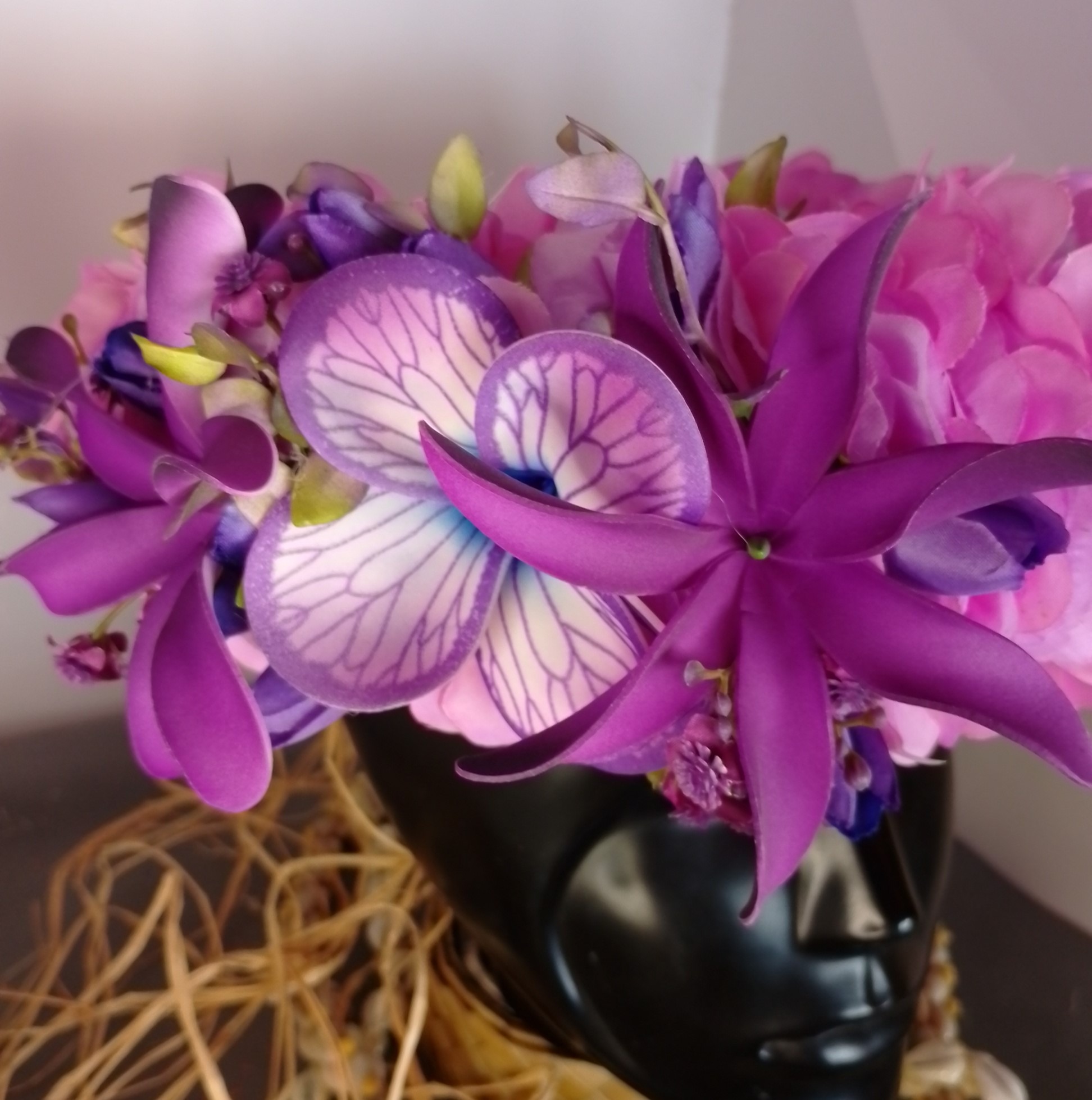 Couronne fleurs Tahiti mauve deux maxi tiare tipanie décor aile de papillon