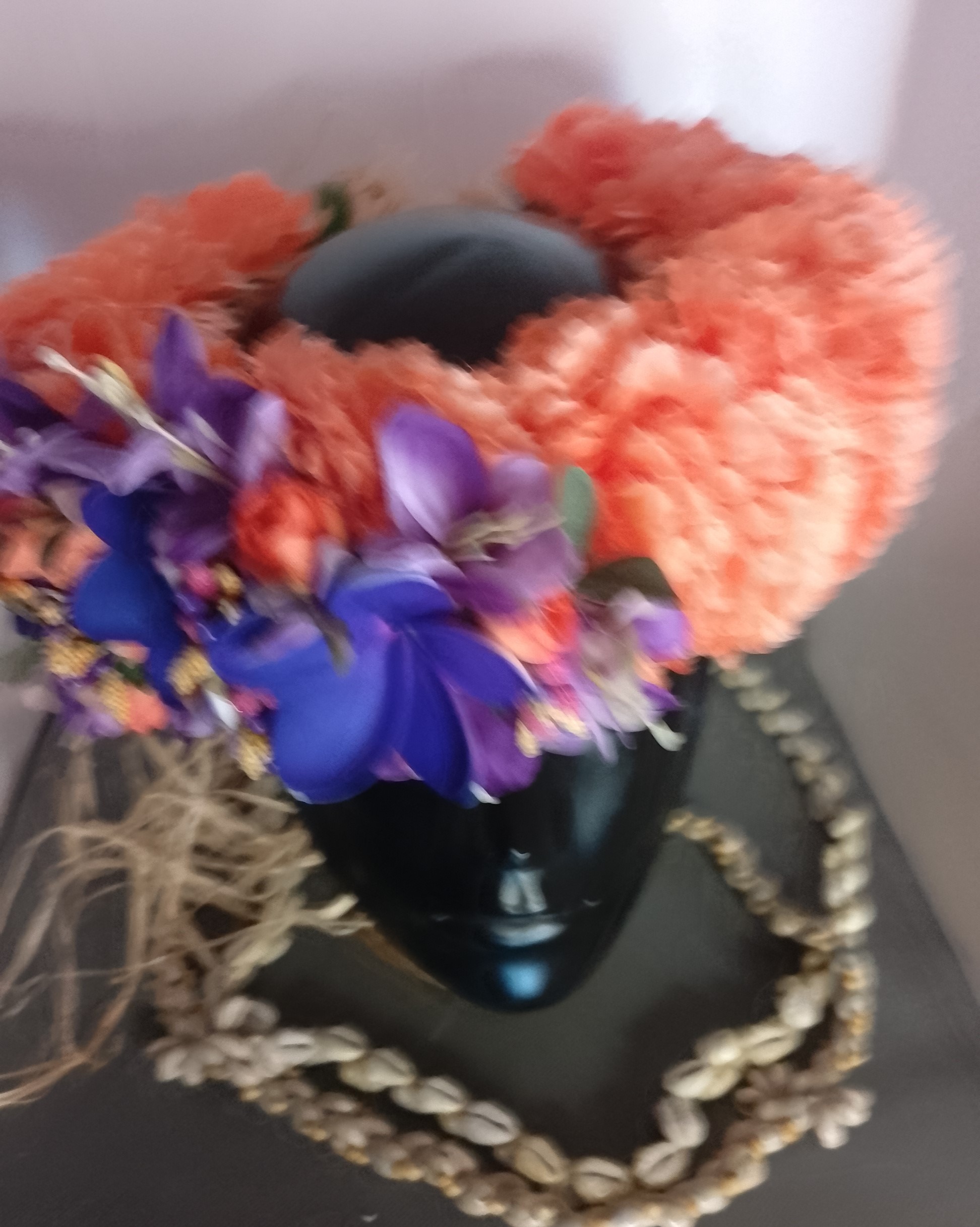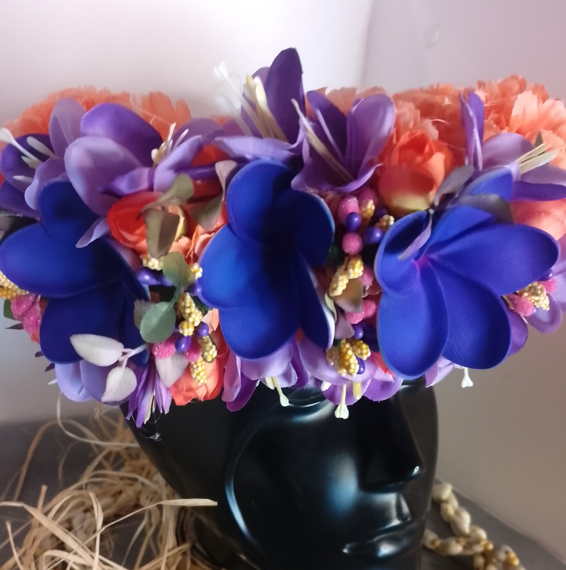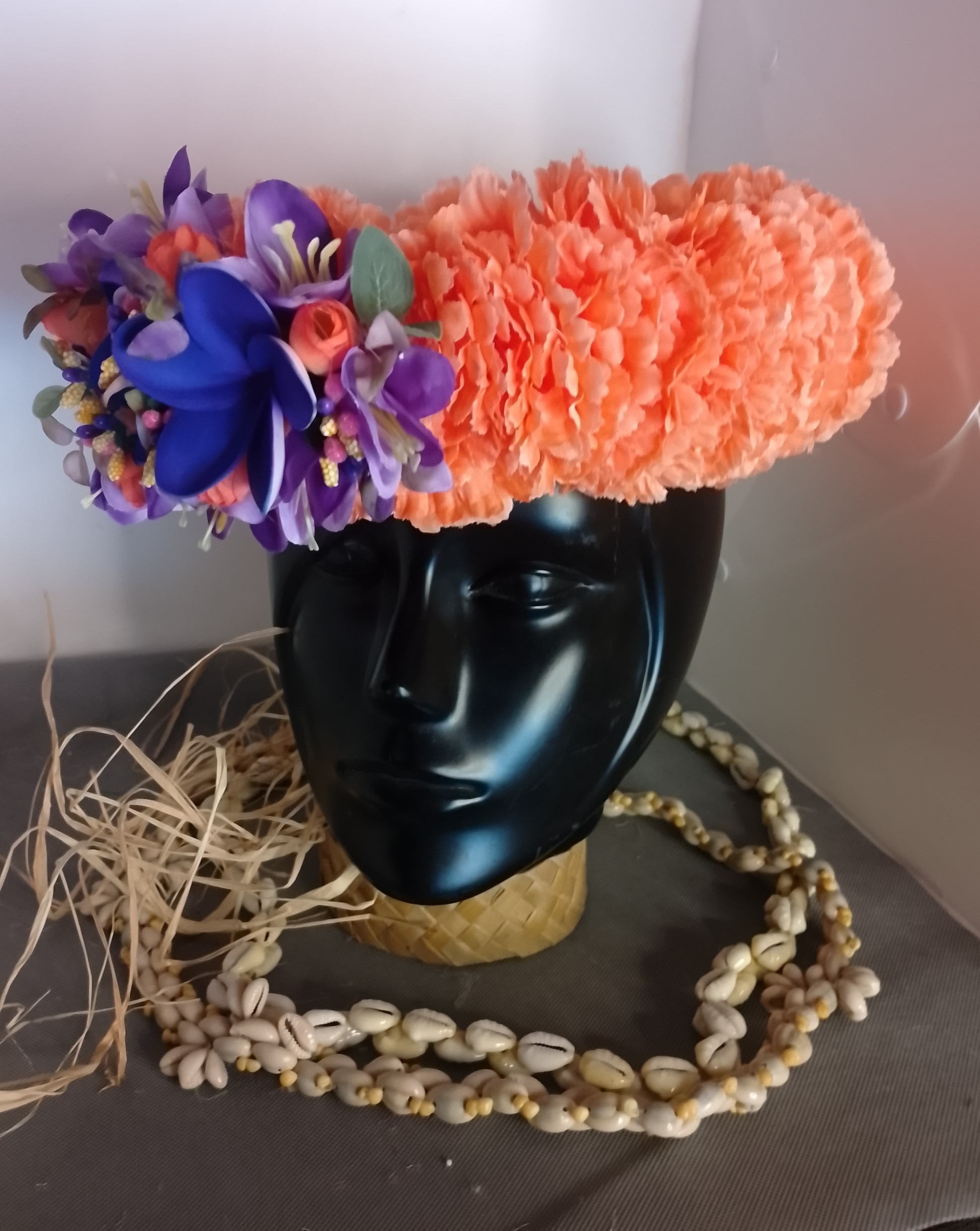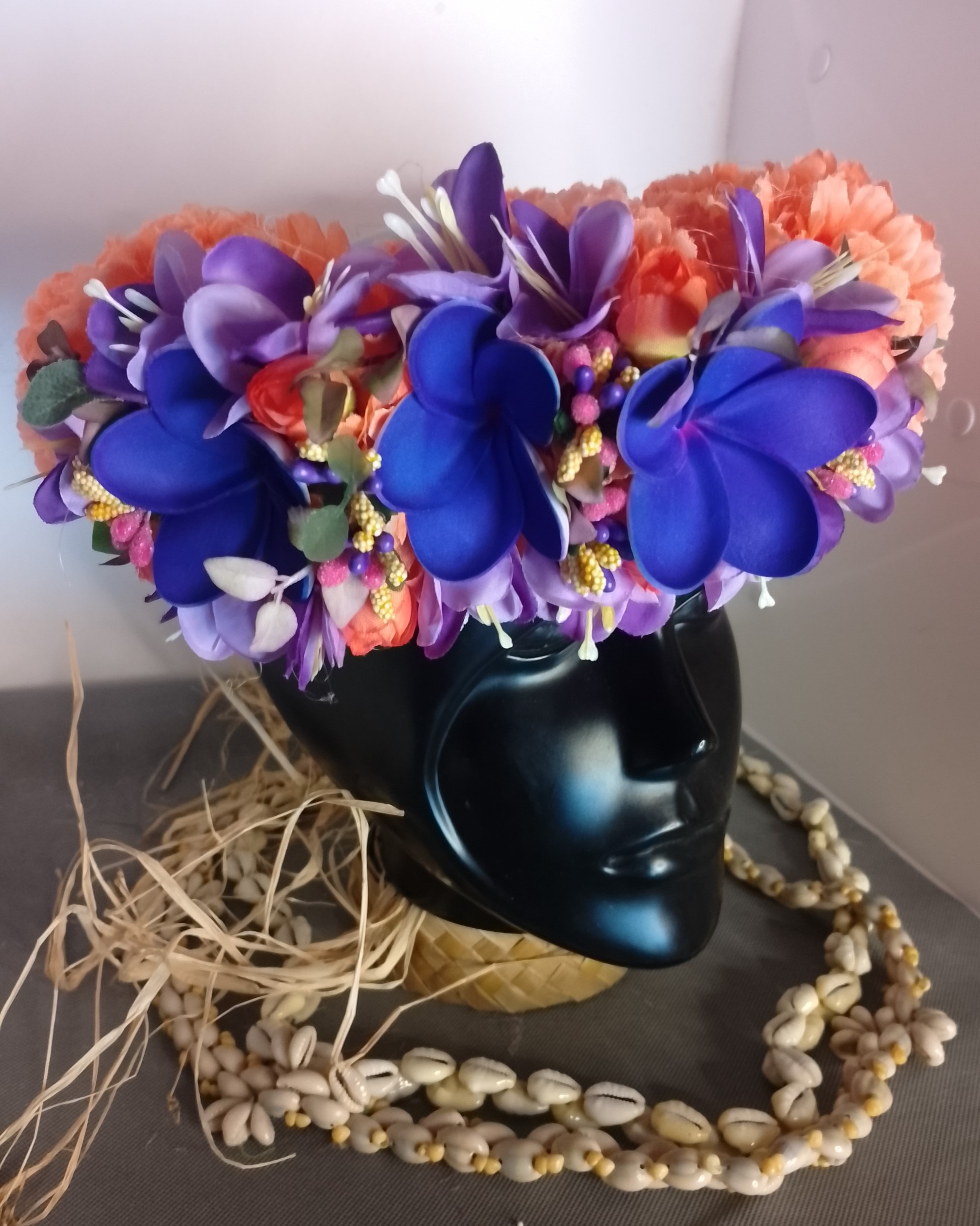 Pour la Couronne de fleur Tahiti orange trois tipanie violets la base de raphia tressé se termine par des liens. Ainsi elle peut s’ajuster au tour de tête de la vahine.