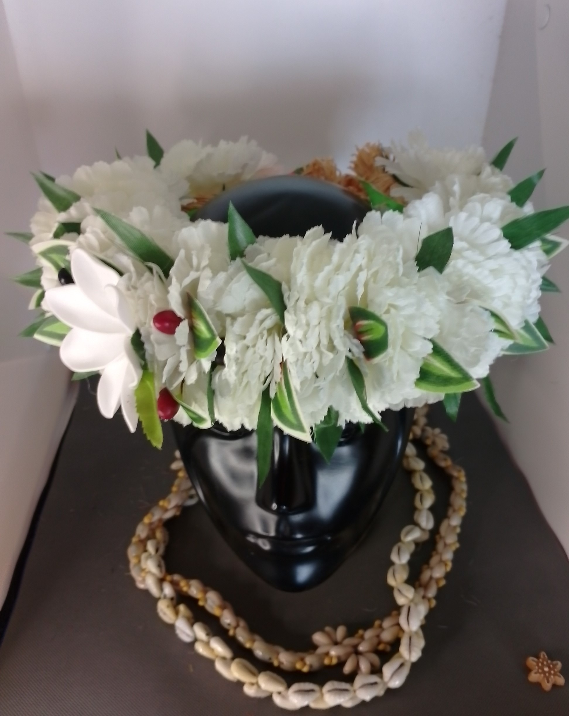 Couronne tiare Tahiti blanche corolle de feuillage varié grande tiare Tahiti