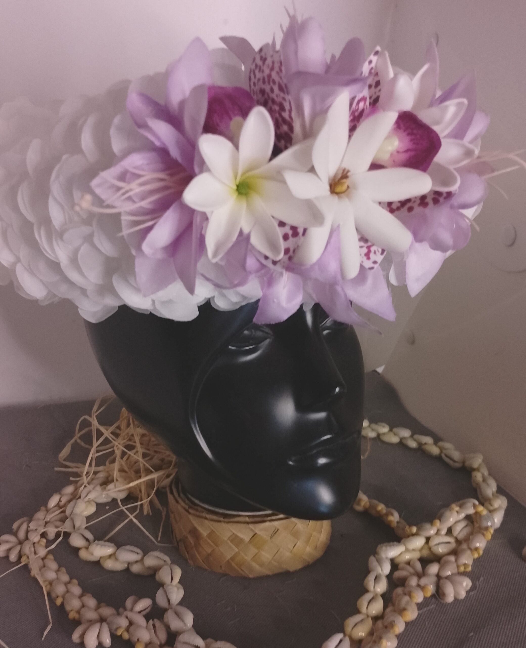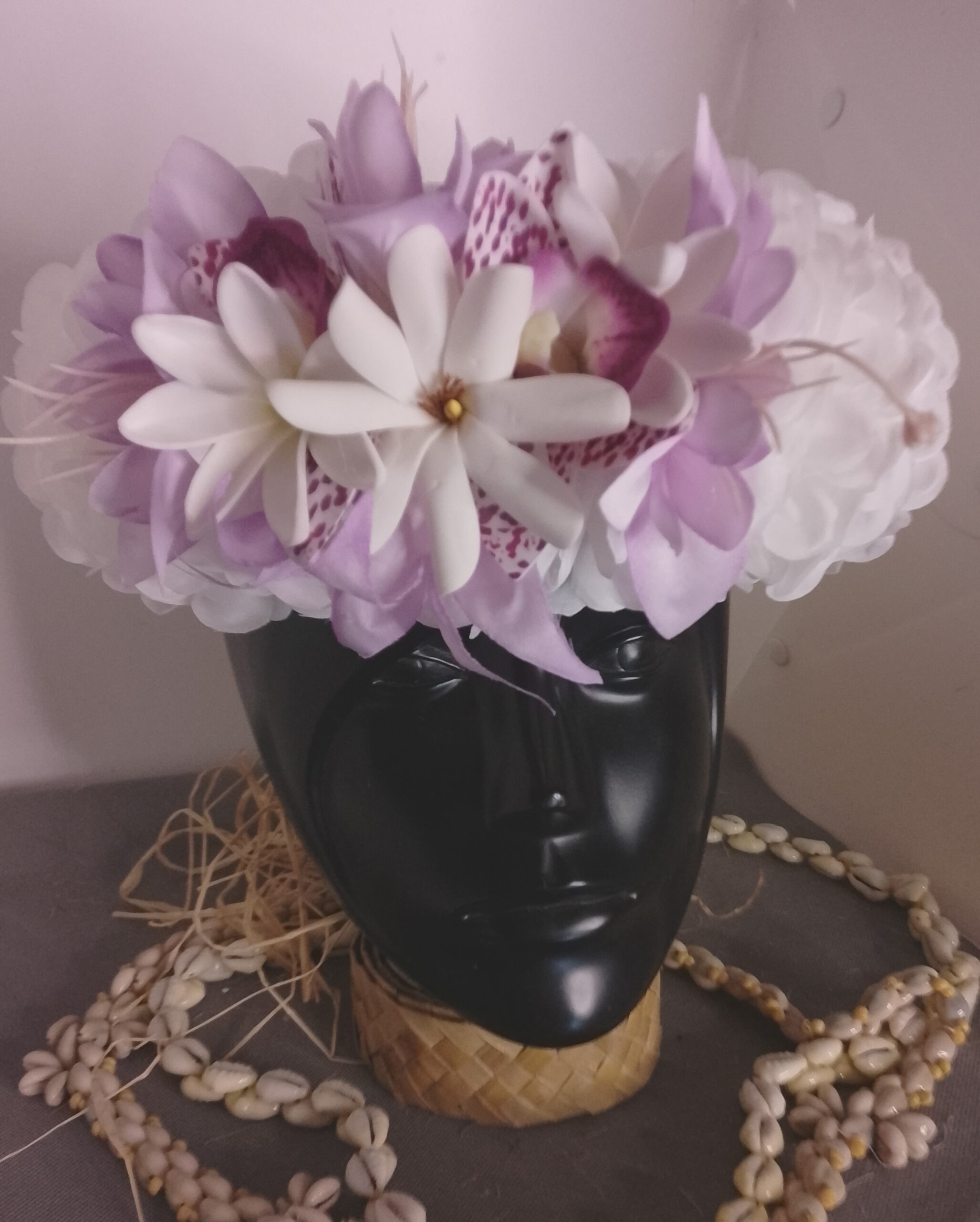 Couronne tiare Tahiti blanche deux tiare entre ouvertes orchidées lys mauves tiare