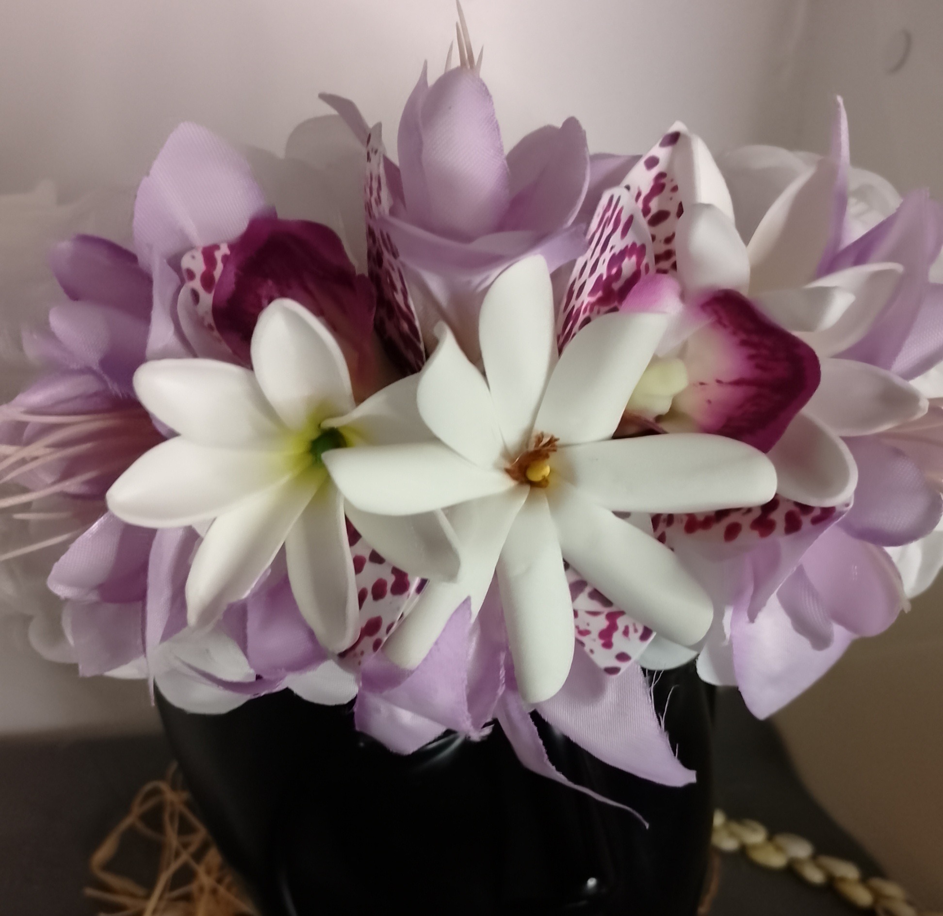 - pour le bouquet : possibilités de choisir une large gamme de fleurs de tiare, de tipanie de Tahiti (pluméria, frangipanier), d’orchidées, de bougainvilliers, d’hibiscus en mousse ou en tissu