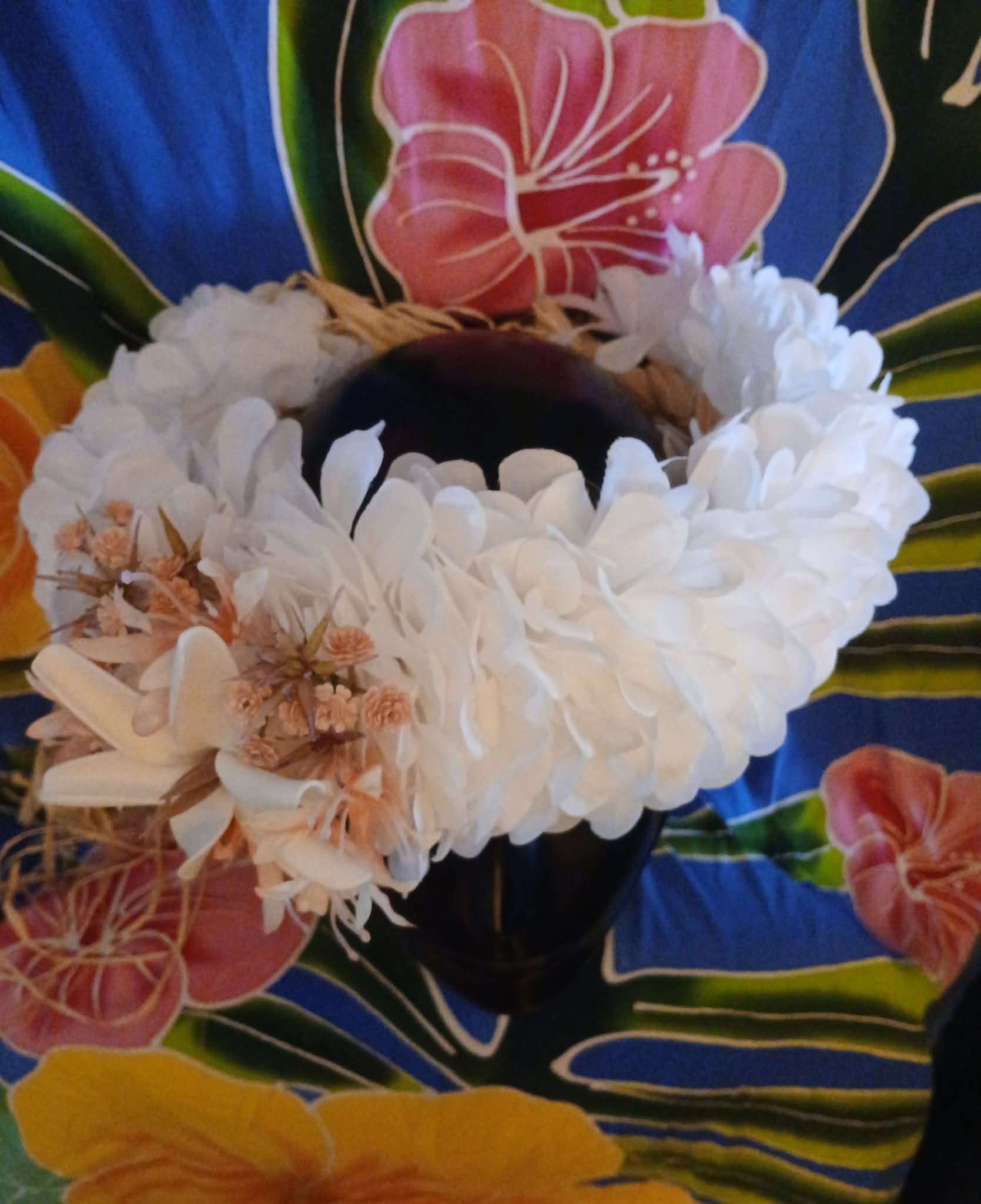 Donc les couronnes et colliers de fleurs sont traditionnellement utilisés en Polynésie pour accueillir les visiteurs. Offrir ou porter des fleurs est un geste d’hospitalité, de respect et de bienvenue. Cela crée une atmosphère chaleureuse et accueillante, que ce soit pour des invités ou pour soi-même.
