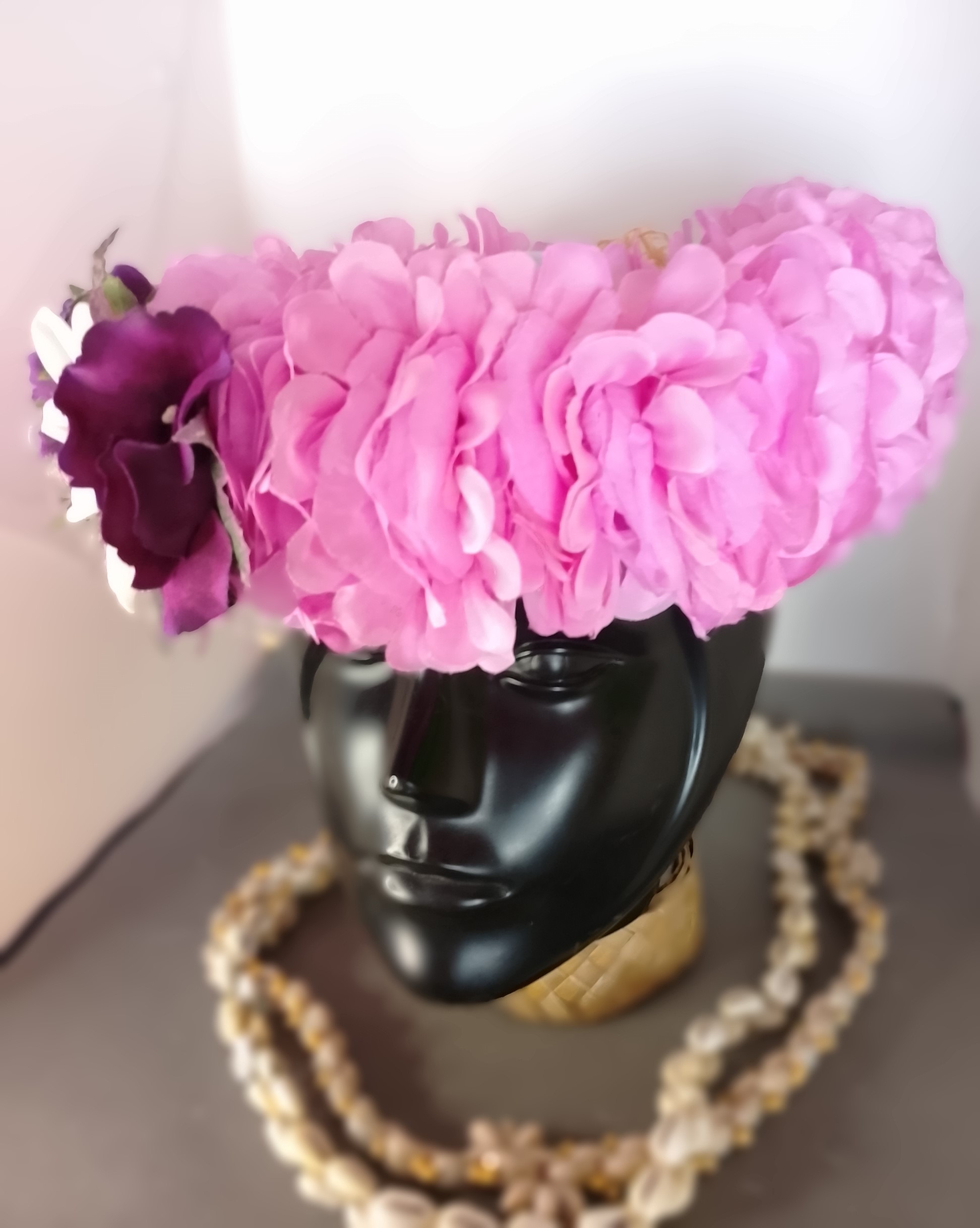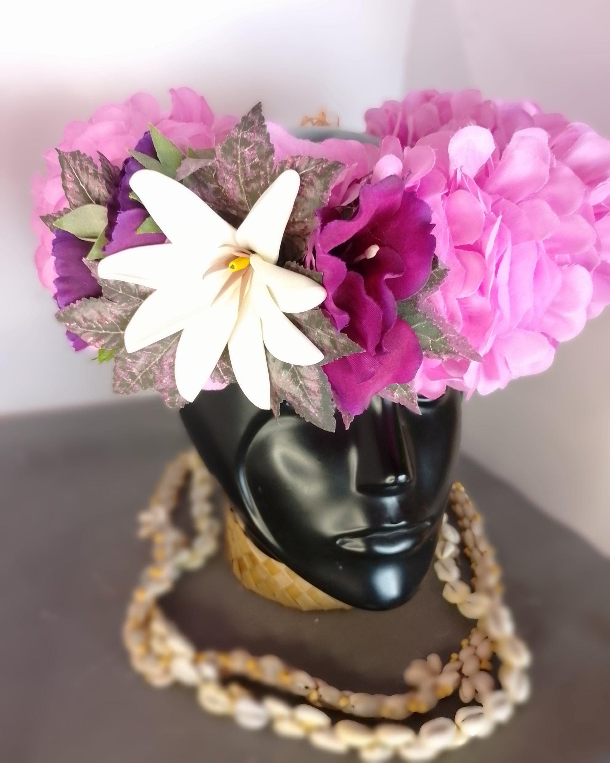 Couronne tiare Tahiti mauve grande tiare feuillage nuances mauves
