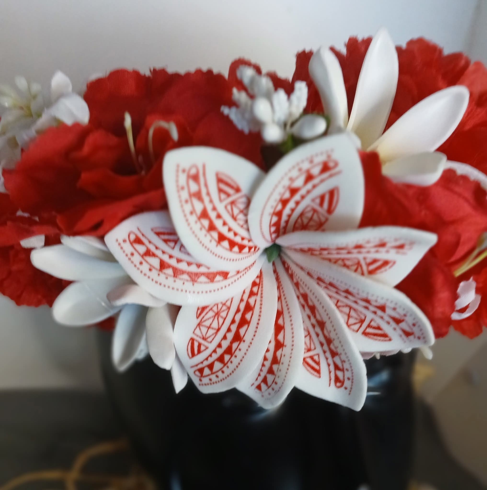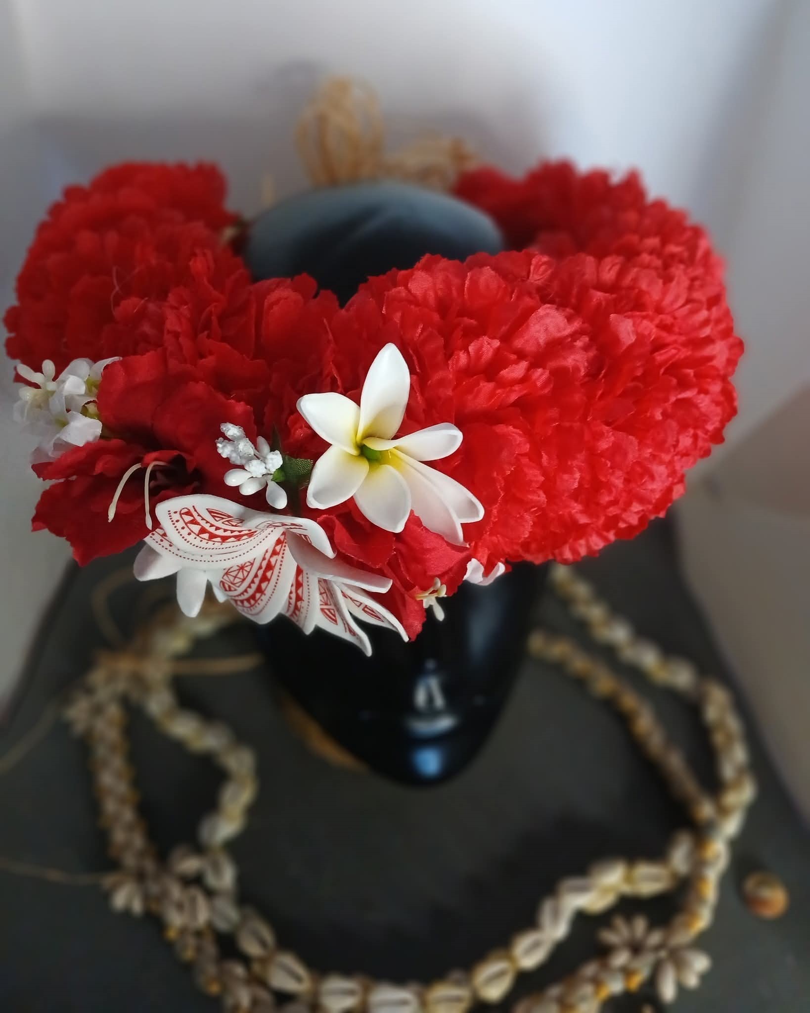 La base de la couronne florale est habillée de pétales « Moorea » rouges. Ils sont nommés ainsi en raison de la découpe des bords des pétales évoquant les côtes de Moorea.