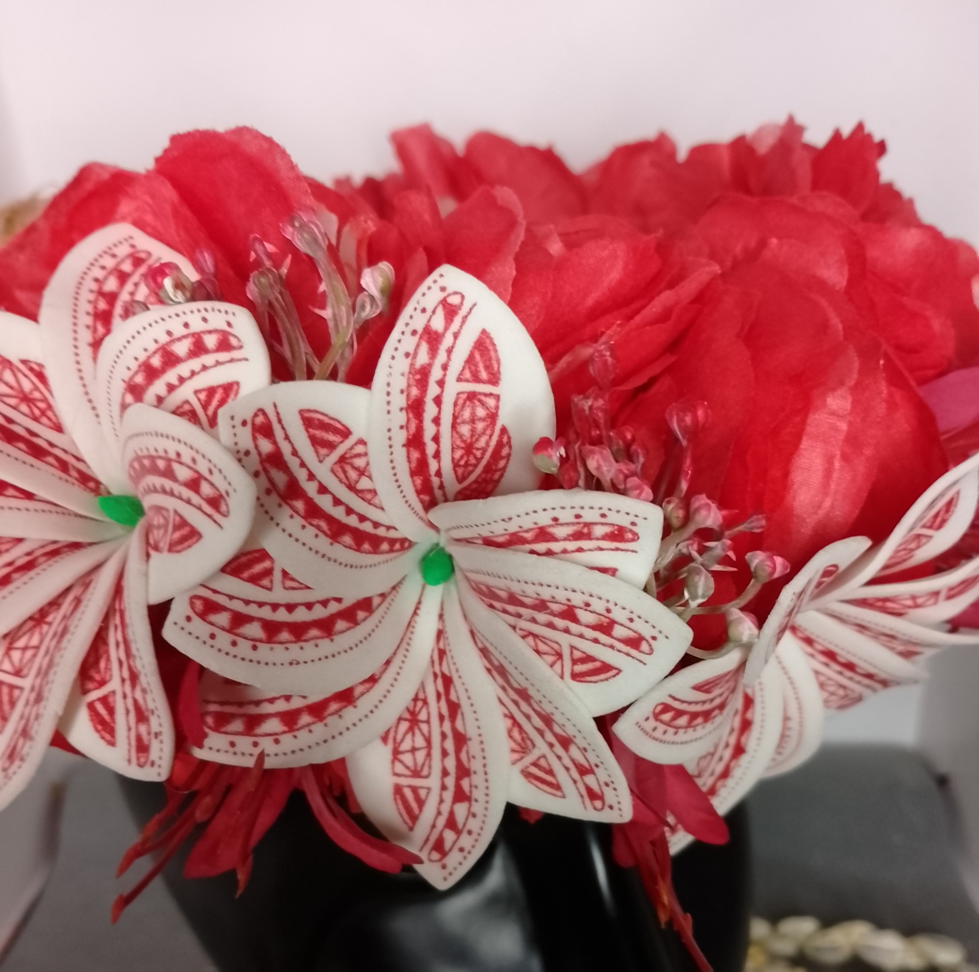 Puis le bouquet est composé de trois tiare de Tahiti tatouées en rouges .