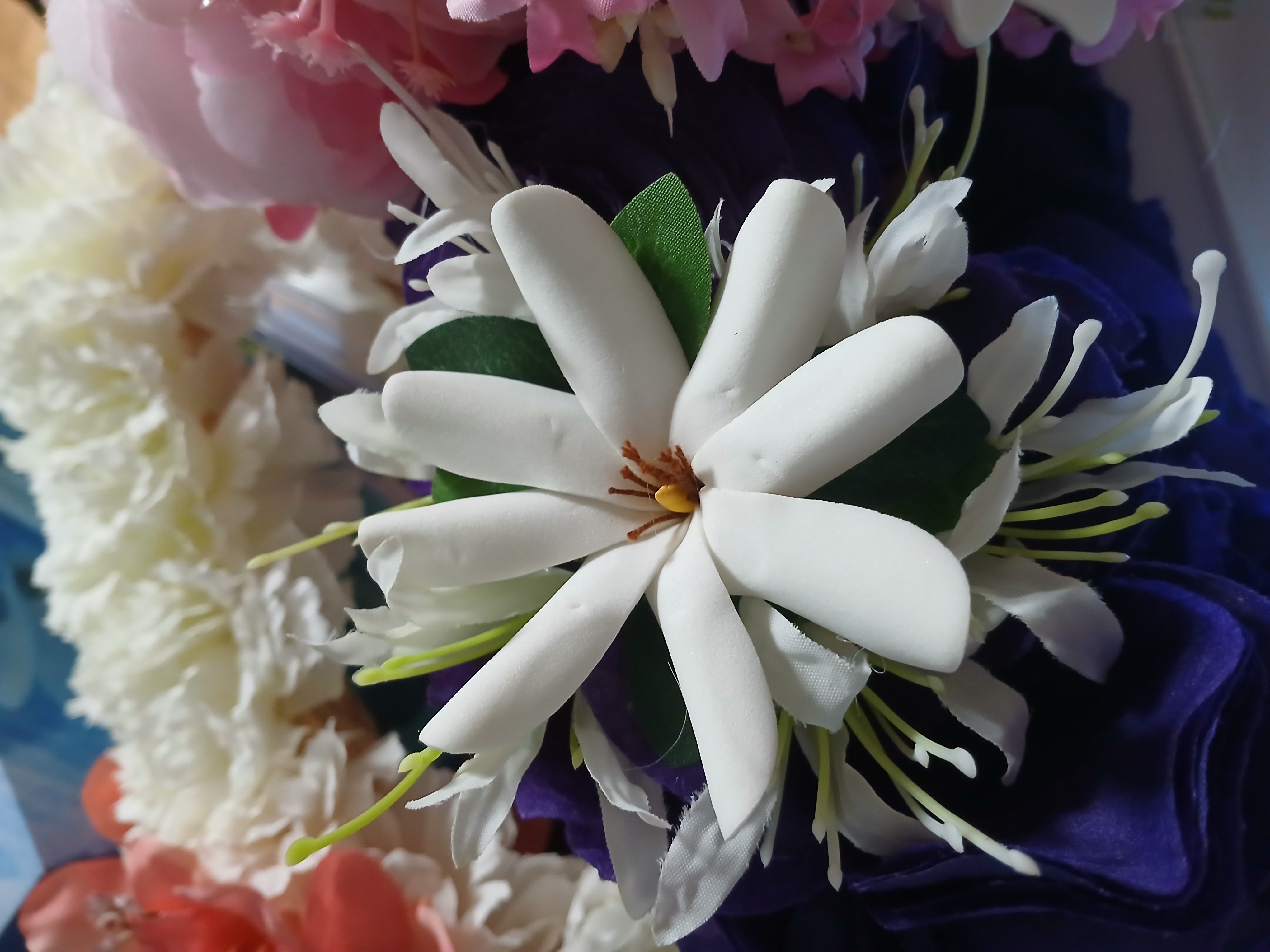 – pour le bouquet : possibilités de choisir une large gamme de fleurs de tiare, de tipanie de Tahiti (frangipanier, pluméria), d’orchidées, de bougainvilliers, d‘hibiscus en mousse ou en tissu