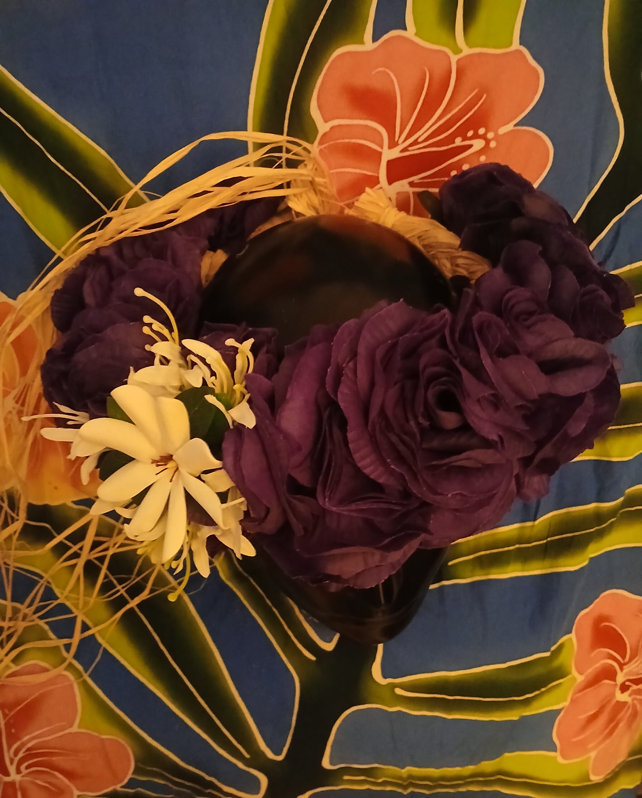 La base de raphia tressé se termine par des liens pour pouvoir s’ajuster au tour de tête de la vahine.