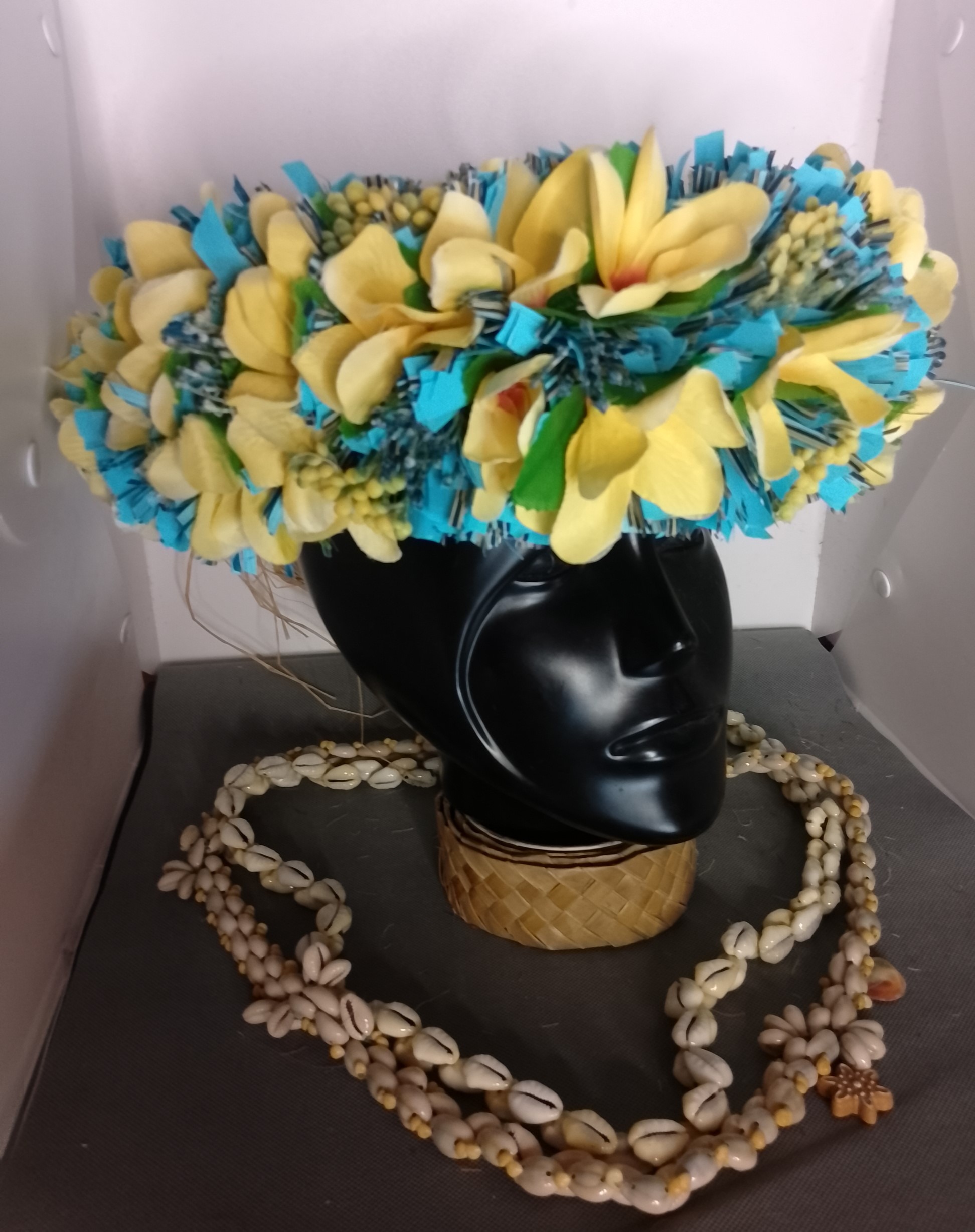 La base de raphia tressé se termine par des liens pour pouvoir s’ajuster au tour de tête de la vahine.