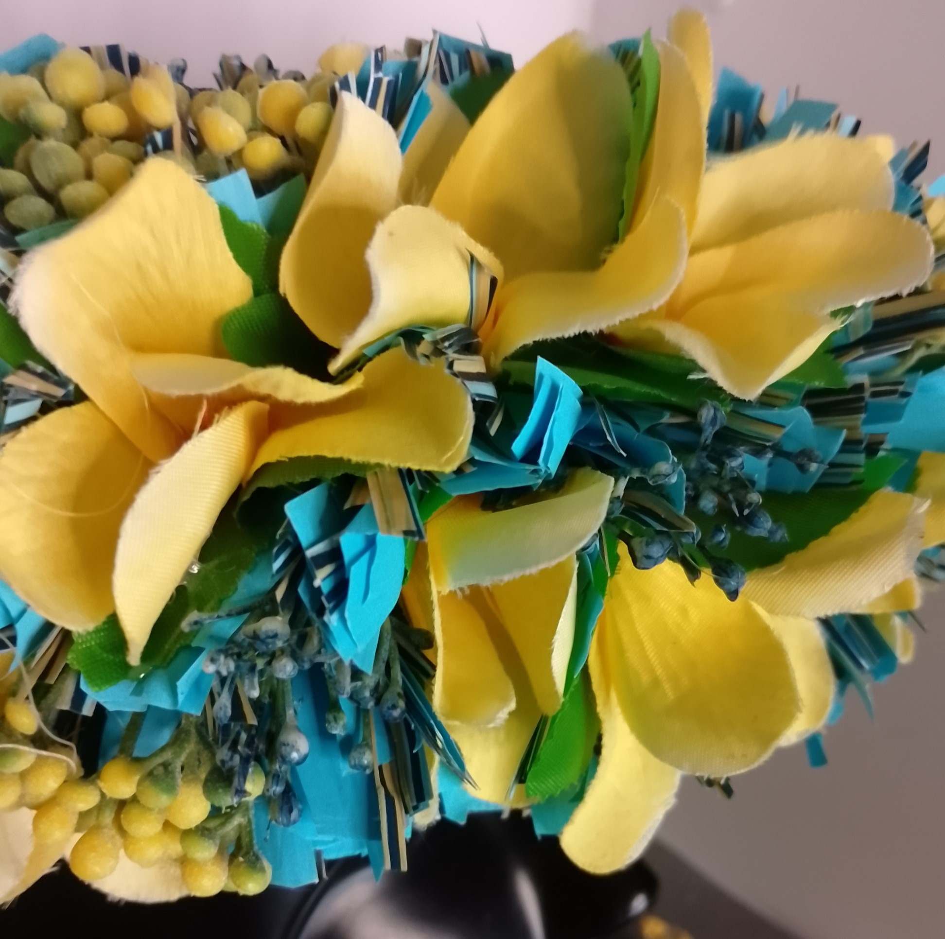 Couronne toute fleur bleu lagon corolle tipanie jaune et graines assorties