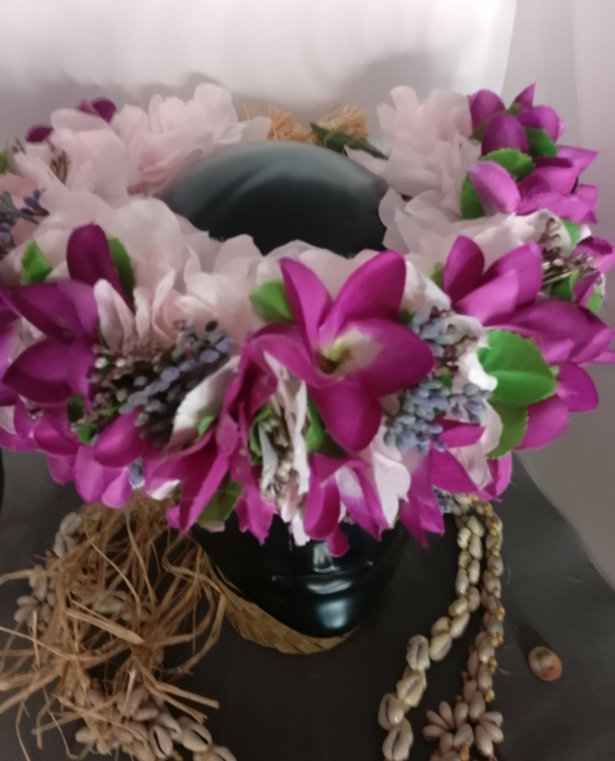 Modèle artisanal de couronne florale de tête à floraison permanente avec fleurs tahitiennes by Vaite.e.Tiare créations