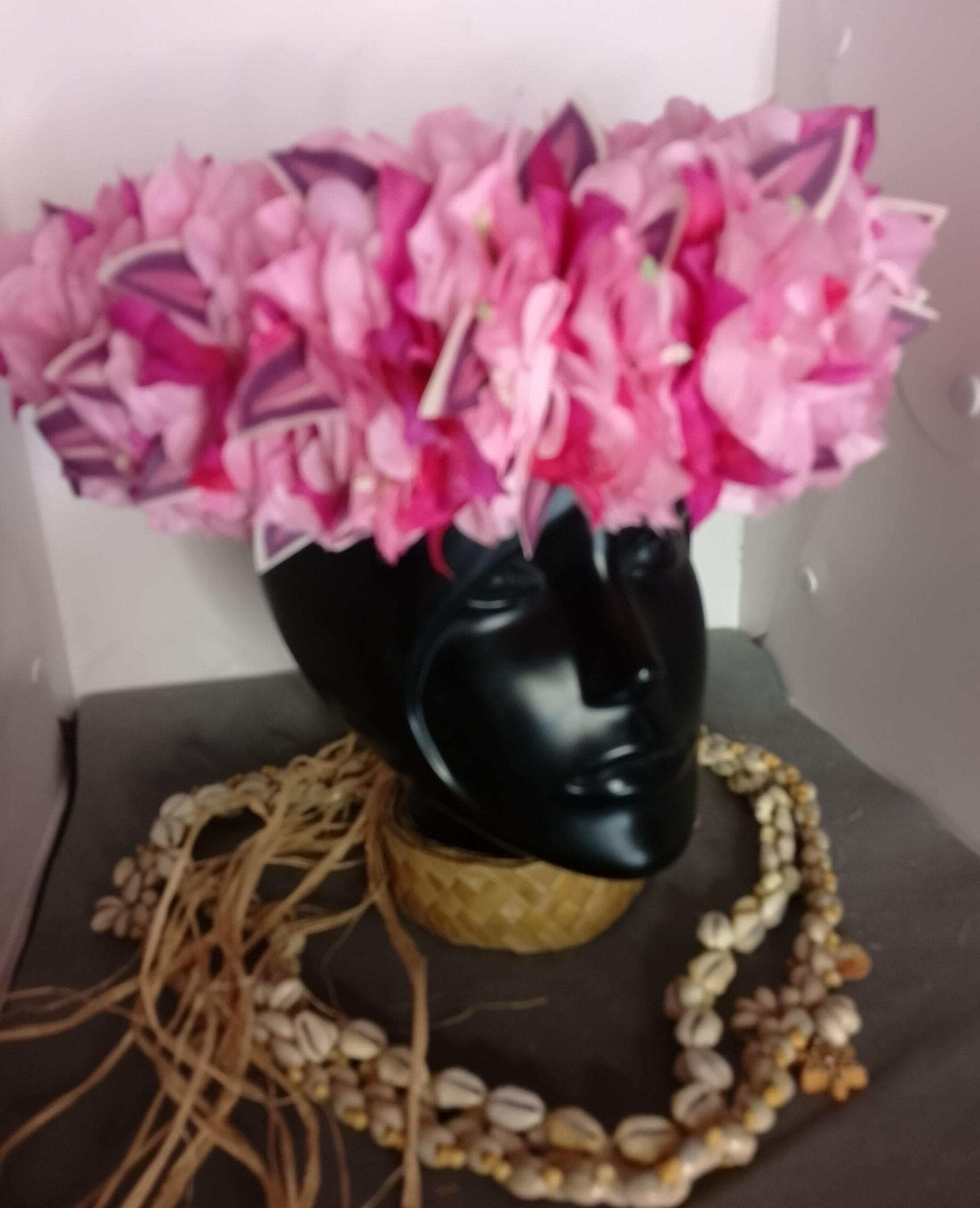 Enfin la Couronne toute fleur Tahiti bougainvillier rose pâle et fuchsia est parée de quelques feuilles prunes au cœur rosé.