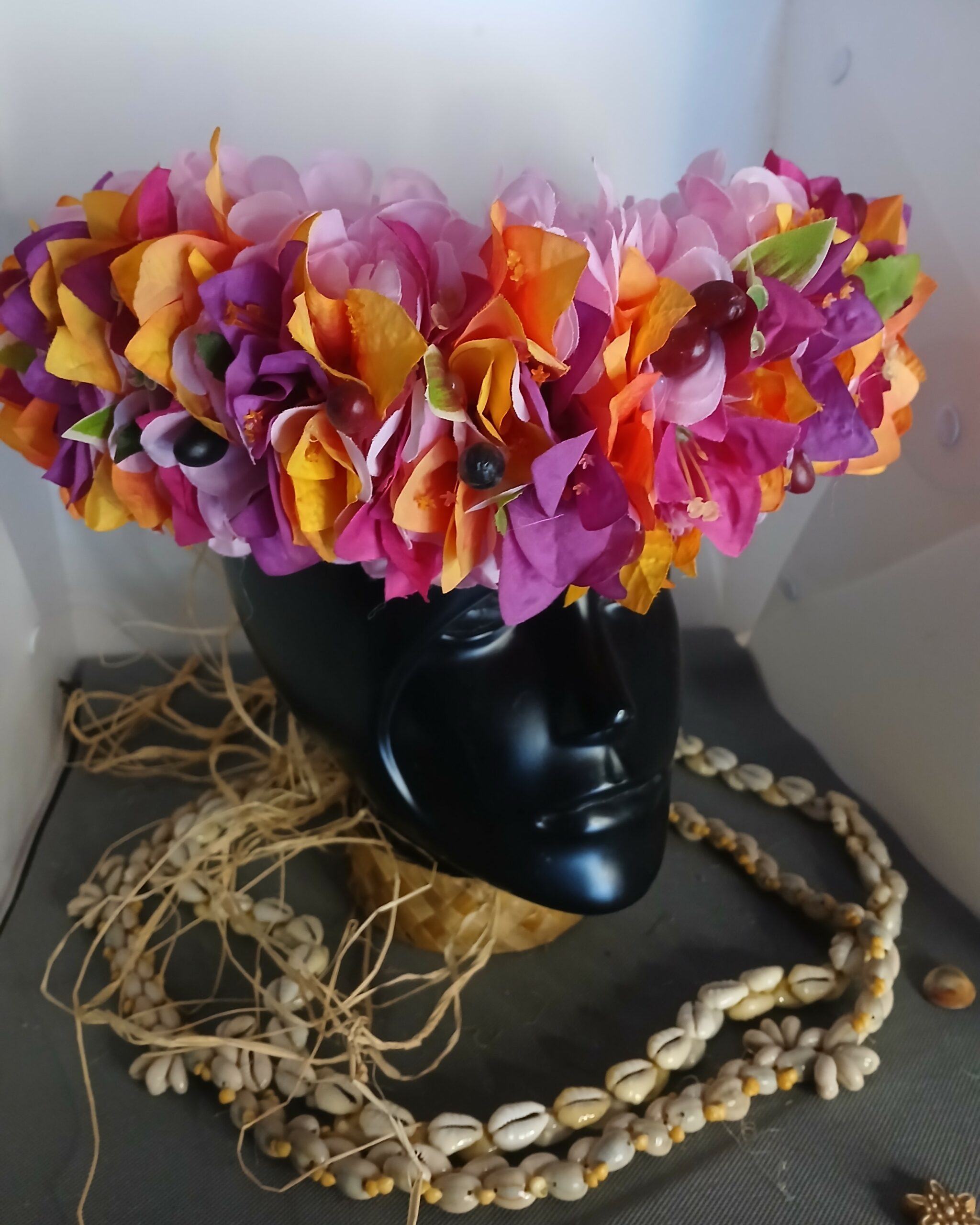 Couronne toute fleur Tahiti mauve bougainvillier fuchsia violet et orangé accompagnés de graines noires et bordeaux
