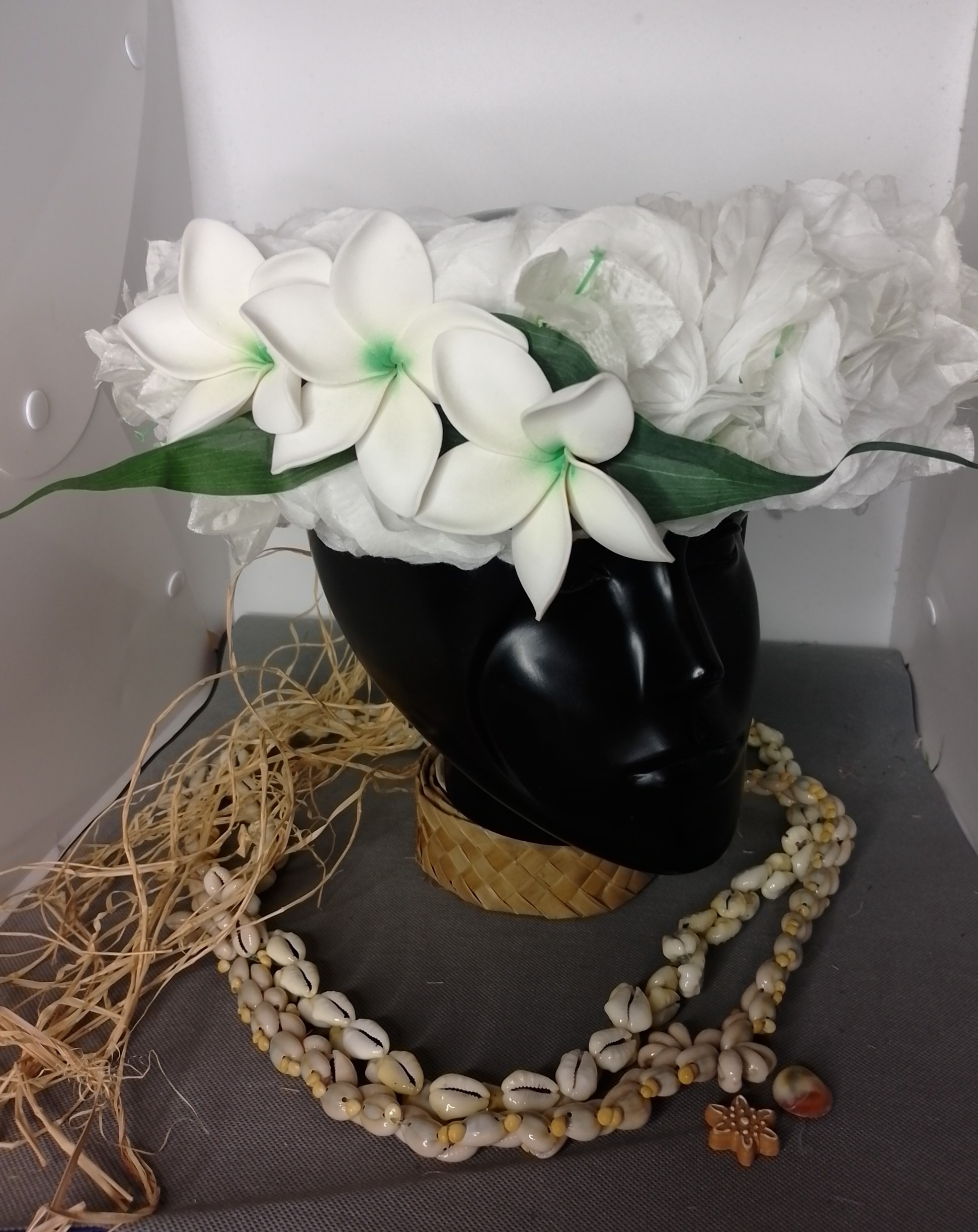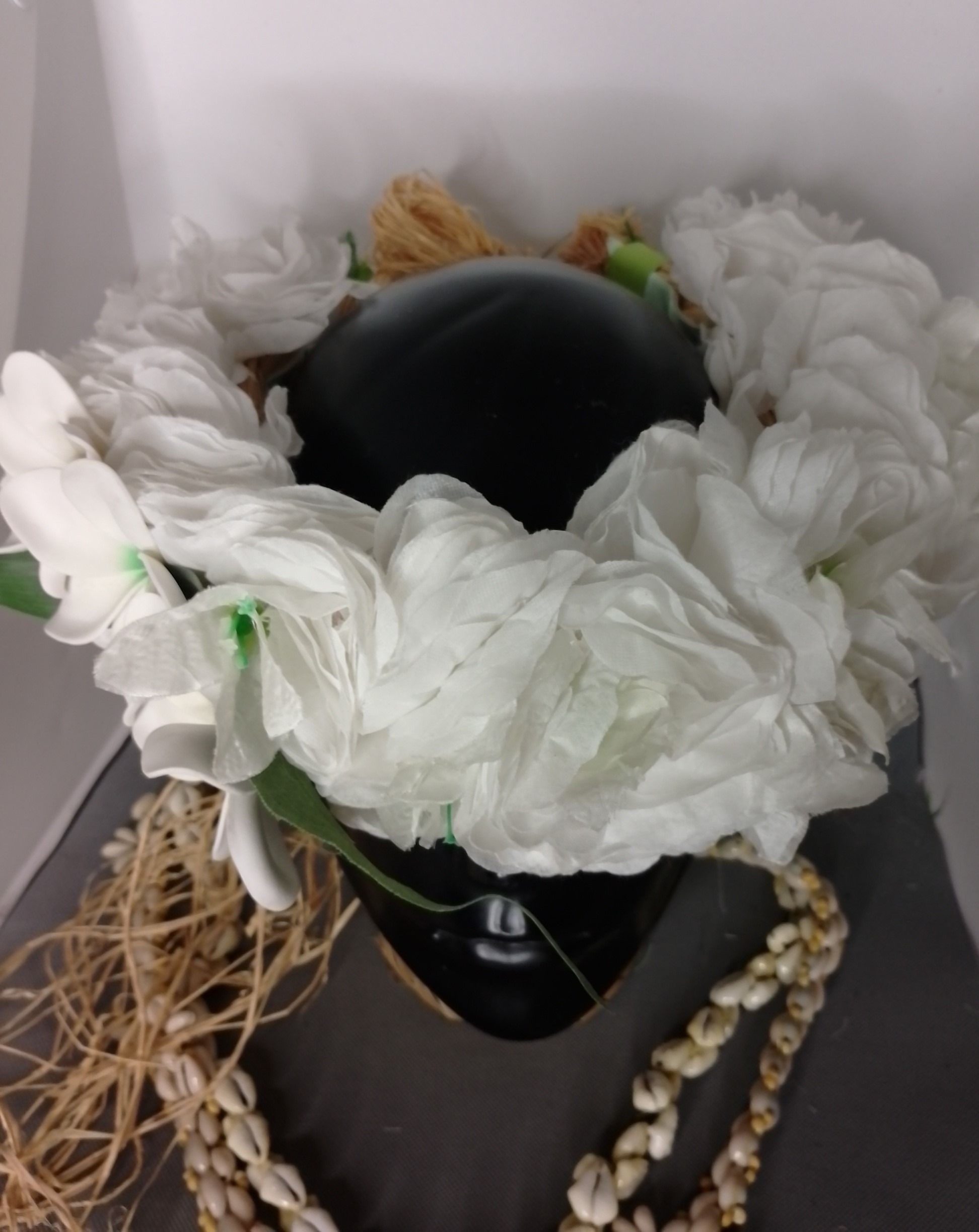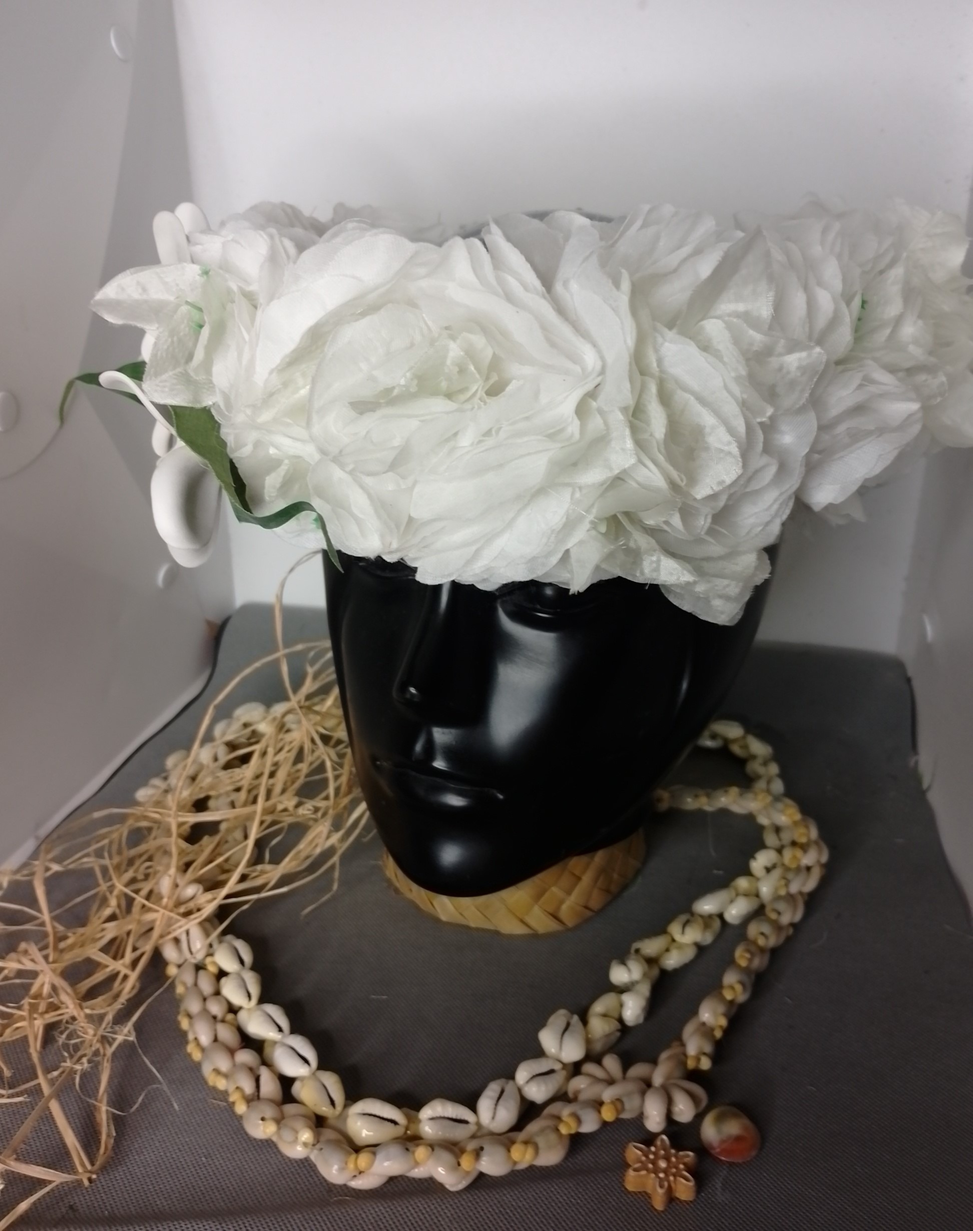 La base de raphia tressé de cette Couronne fleur Tahiti blanche bougainvillier blanc trois tipanie blancs cœur vert se termine par des liens. Elle va donc pouvoir s’ajuster au tour de tête de la vahine.