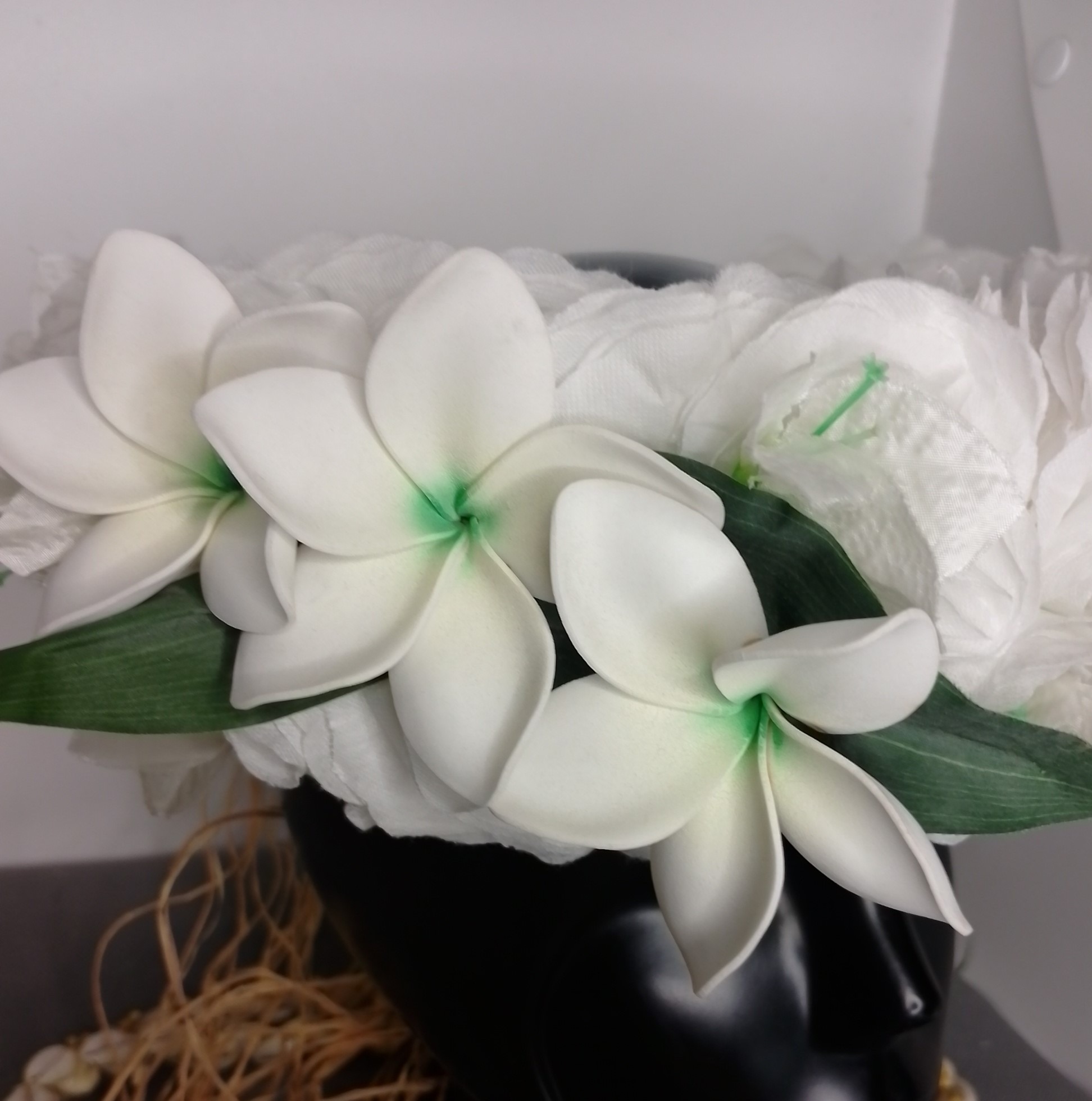 Couronne fleur Tahiti blanche bougainvillier blanc trois tipanie blancs cœur vert