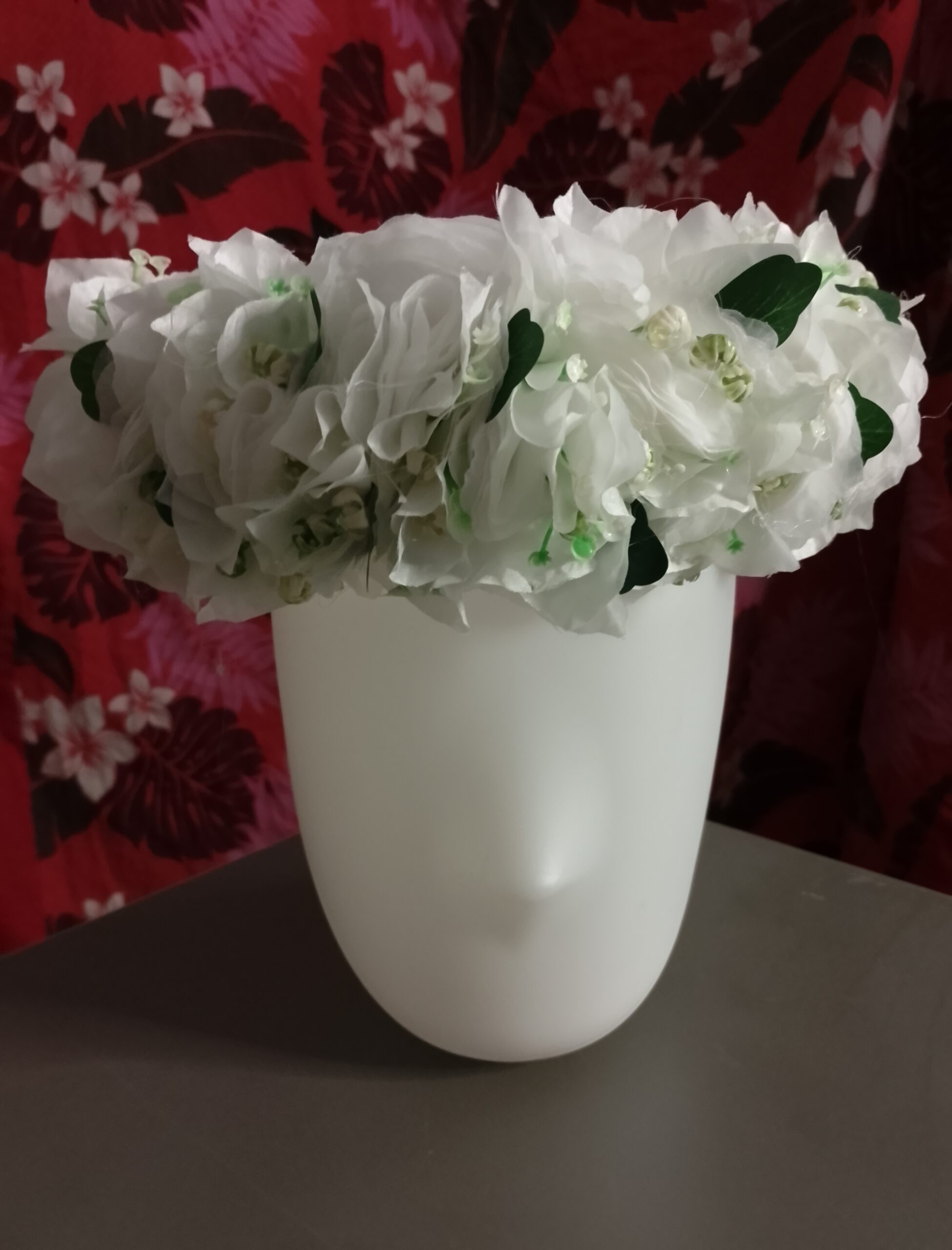 La base est habillée de brins de bougainvilliers blancs qui couvent toute la couronne. Entre lesquels s’intercalent des graines et de petites feuilles.