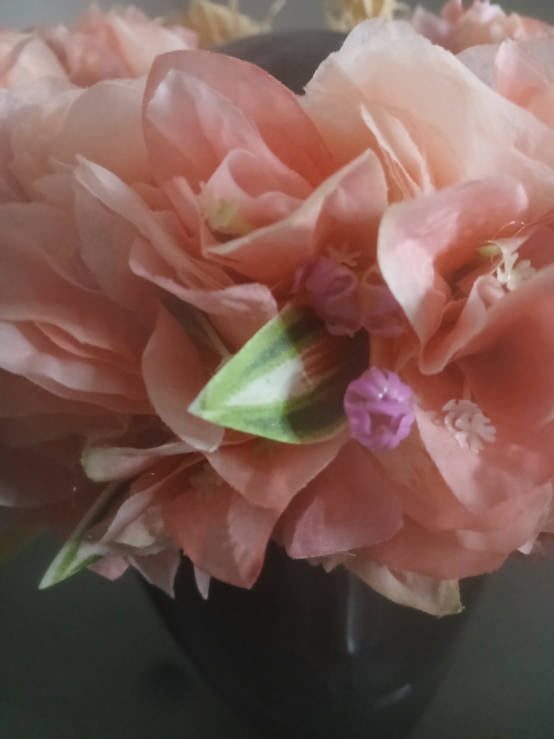 La base est habillée de brins de bougainvilliers champagne rosé qui couvent toute la couronne. Entre lesquels s’intercalent de brins de gypsophile rose et de petites feuilles.